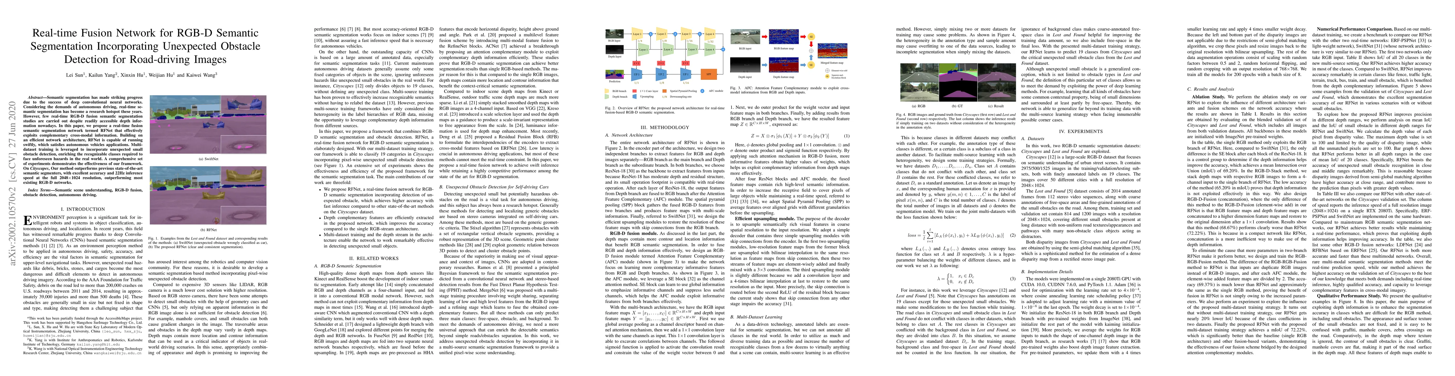 This paper introduces RFNet, a real-time fusion network for RGB-D semantic segmentation that leverages depth information to enhance autonomous driving applications. The proposed method effectively detects unexpected obstacles through multi-dataset training, achieving superior accuracy and a high inference speed of 22Hz at 2048x1024 resolution.