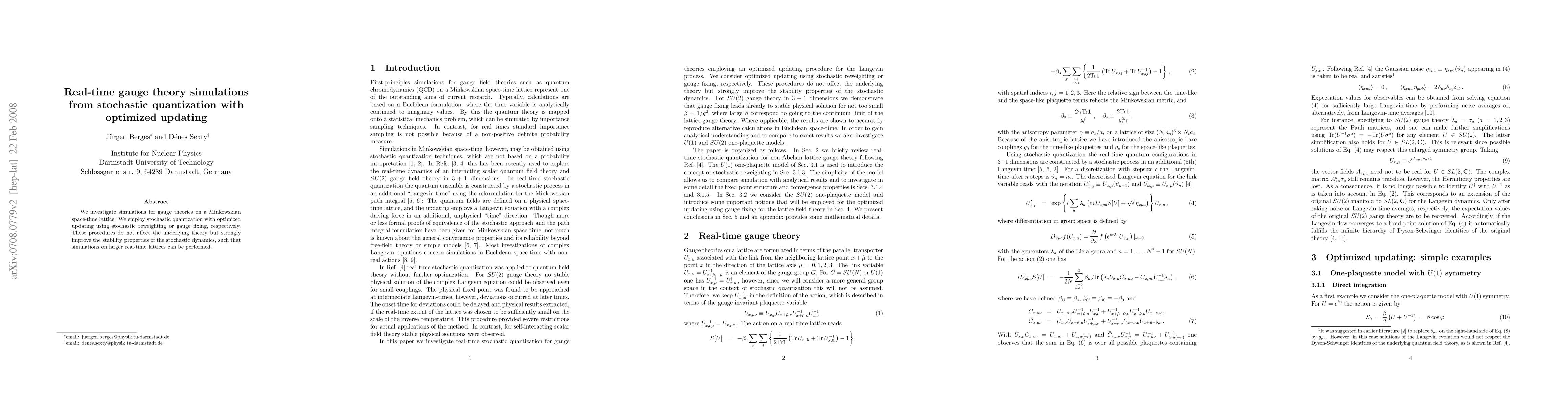This paper explores gauge theory simulations on Minkowskian space-time lattices using stochastic quantization with optimized updating techniques, which enhance stability and enable simulations on larger real-time lattices without altering the underlying theory.