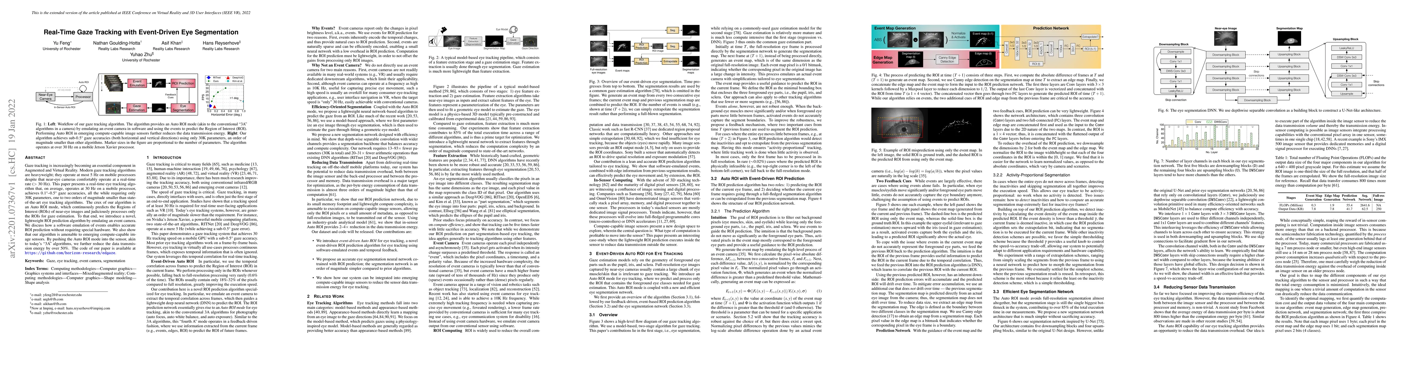 Gaze tracking is increasingly becoming an essential component in Augmented and Virtual Reality. Modern gaze tracking al gorithms are heavyweight; they operate at most 5 Hz on mobile processors despite that near-eye cameras comfortably operate at a r eal-time rate ($>$ 30 Hz). This paper presents a real-time eye tracking algorithm that, on average, operates at 30 Hz on a mobile processor, achieves \ang{0.1}--\ang{0.5} gaze accuracies, all the while requiring only 30K parameters, one to two orders of magn itude smaller than state-of-the-art eye tracking algorithms. The crux of our algorithm is an Auto~ROI mode, which continuously pr edicts the Regions of Interest (ROIs) of near-eye images and judiciously processes only the ROIs for gaze estimation. To that end, we introduce a novel, lightweight ROI prediction algorithm by emulating an event camera. We discuss how a software emulation of events enables accurate ROI prediction without requiring special hardware. The code of our paper is available at https://github.com/horizon-research/edgaze.