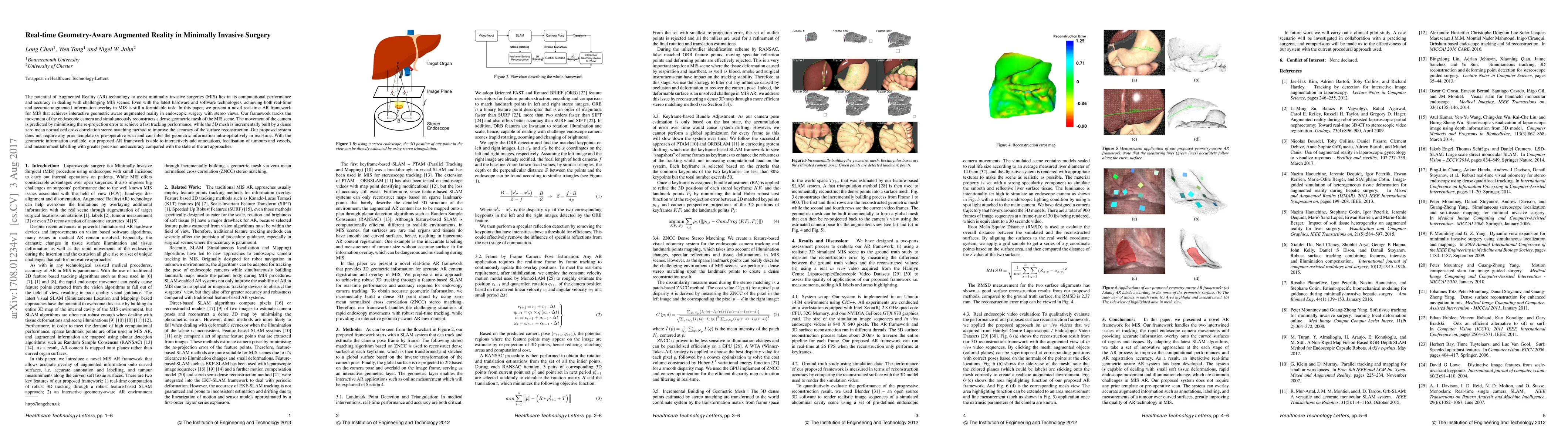 The potential of Augmented Reality (AR) technology to assist minimally invasive surgeries (MIS) lies in its computational performance and accuracy in dealing with challenging MIS scenes. Even with the latest hardware and software technologies, achieving both real-time and accurate augmented information overlay in MIS is still a formidable task. In this paper, we present a novel real-time AR framework for MIS that achieves interactive geometric aware augmented reality in endoscopic surgery with stereo views. Our framework tracks the movement of the endoscopic camera and simultaneously reconstructs a dense geometric mesh of the MIS scene. The movement of the camera is predicted by minimising the re-projection error to achieve a fast tracking performance, while the 3D mesh is incrementally built by a dense zero mean normalised cross correlation stereo matching method to improve the accuracy of the surface reconstruction. Our proposed system does not require any prior template or pre-operative scan and can infer the geometric information intra-operatively in real-time. With the geometric information available, our proposed AR framework is able to interactively add annotations, localisation of tumours and vessels, and measurement labelling with greater precision and accuracy compared with the state of the art approaches.