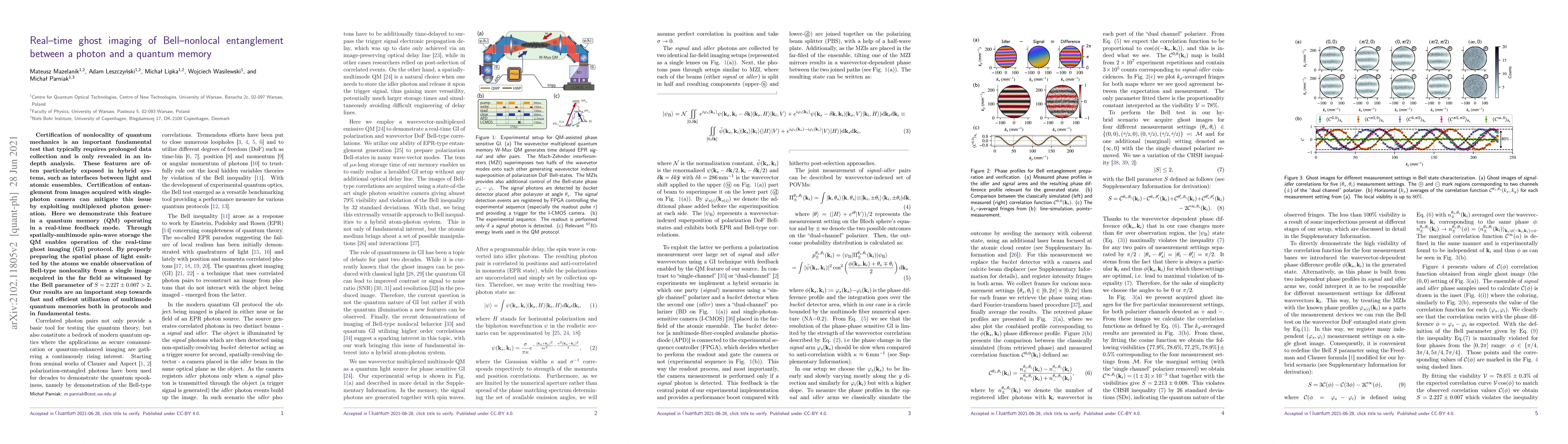 This paper demonstrates real-time ghost imaging of Bell-nonlocal entanglement between a photon and a quantum memory, achieving certification of quantum mechanics' nonlocality in a single image. The quantum memory enables real-time feedback and spatially-multimode spin-wave storage, resulting in a Bell parameter $S=2.227\pm0.007$ that confirms entanglement.