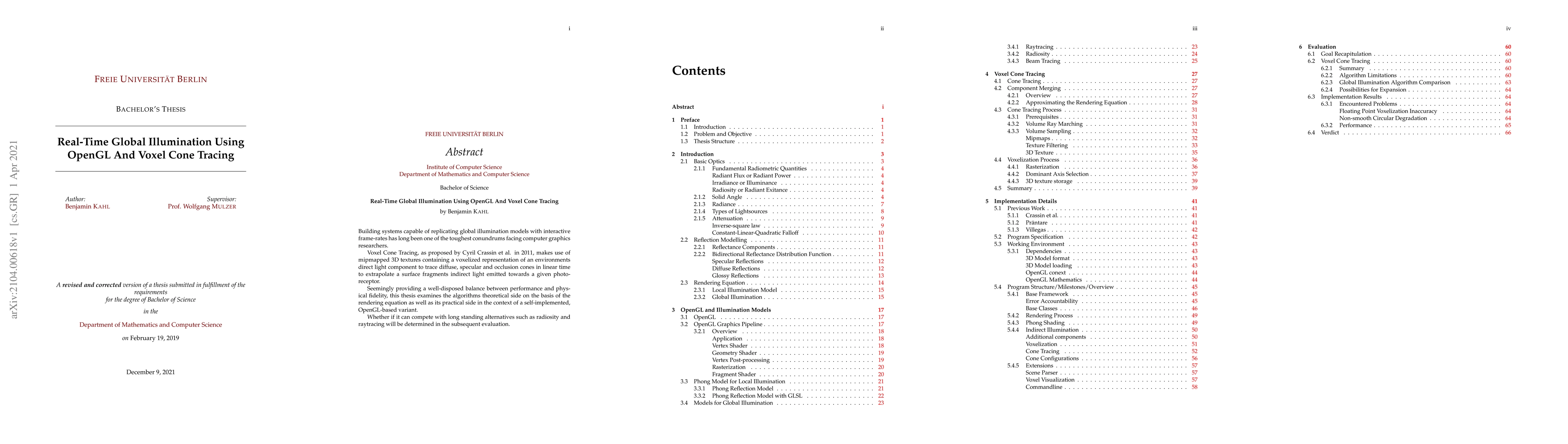 This research paper explores Real-Time Global Illumination using Voxel Cone Tracing, a technique that balances performance and physical fidelity in computer graphics rendering.