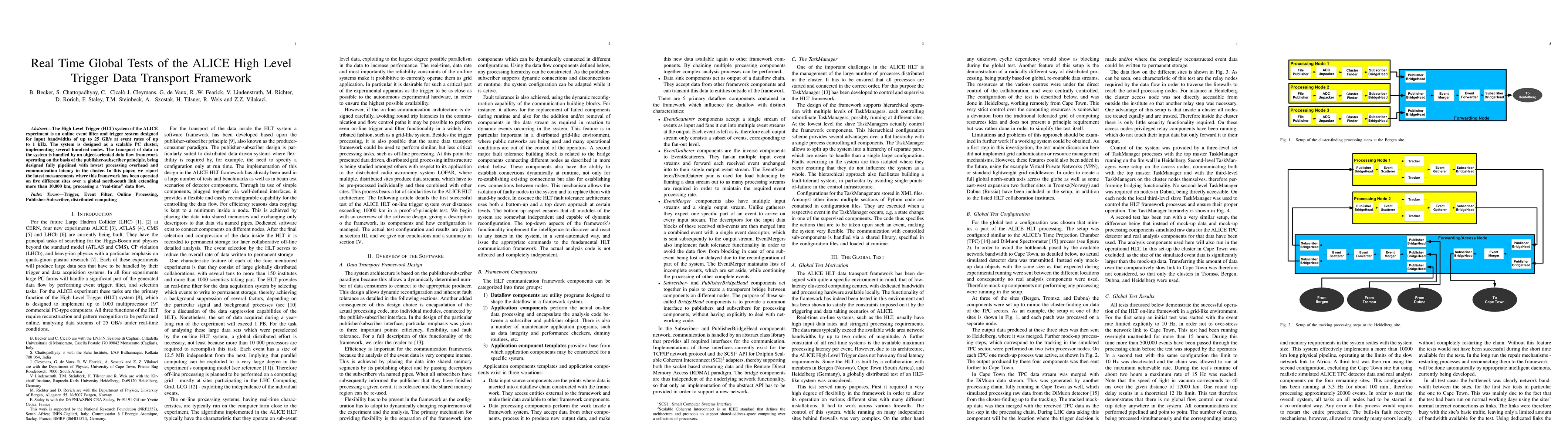 This paper reports on real-time global tests of the ALICE High Level Trigger data transport framework, which operates over a 10,000 km north-south link, demonstrating the system's scalability and low-latency data flow across multiple sites. The framework's performance is evaluated under high input bandwidths and event rates.