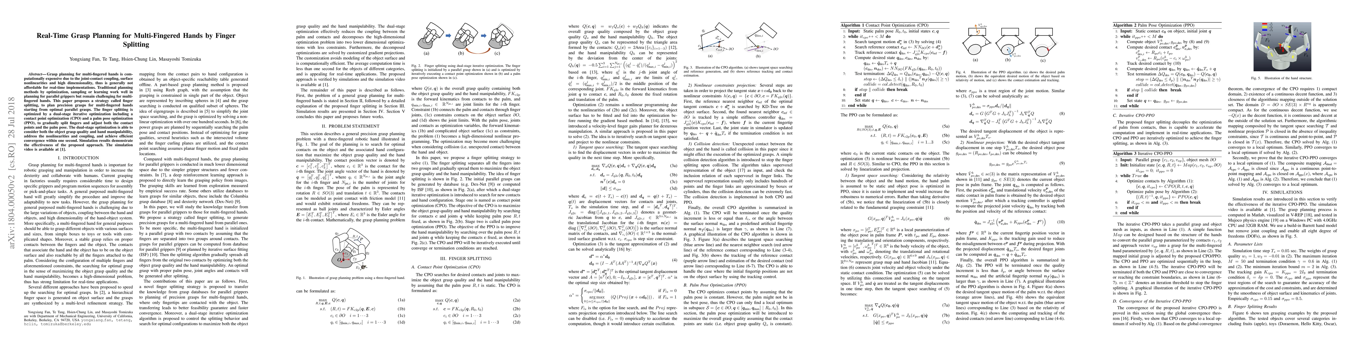 This paper proposes a "finger splitting" strategy for real-time grasp planning in multi-fingered hands, optimizing through dual-stage iterative optimization to address joint-contact coupling and nonlinearities. The method achieves efficient convergence within one second, demonstrating effectiveness in simulations.
