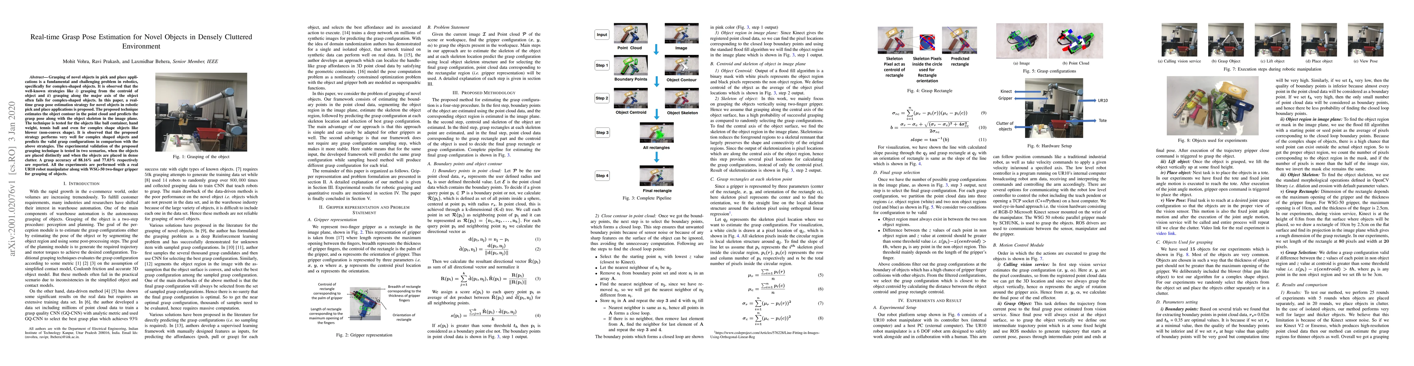 Grasping of novel objects in pick and place applications is a fundamental and challenging problem in robotics, specifically for complex-shaped objects. It is observed that the well-known strategies like \textit{i}) grasping from the centroid of object and \textit{ii}) grasping along the major axis of the object often fails for complex-shaped objects. In this paper, a real-time grasp pose estimation strategy for novel objects in robotic pick and place applications is proposed. The proposed technique estimates the object contour in the point cloud and predicts the grasp pose along with the object skeleton in the image plane. The technique is tested for the objects like ball container, hand weight, tennis ball and even for complex shape objects like blower (non-convex shape). It is observed that the proposed strategy performs very well for complex shaped objects and predicts the valid grasp configurations in comparison with the above strategies. The experimental validation of the proposed grasping technique is tested in two scenarios, when the objects are placed distinctly and when the objects are placed in dense clutter. A grasp accuracy of 88.16\% and 77.03\% respectively are reported. All the experiments are performed with a real UR10 robot manipulator along with WSG-50 two-finger gripper for grasping of objects.