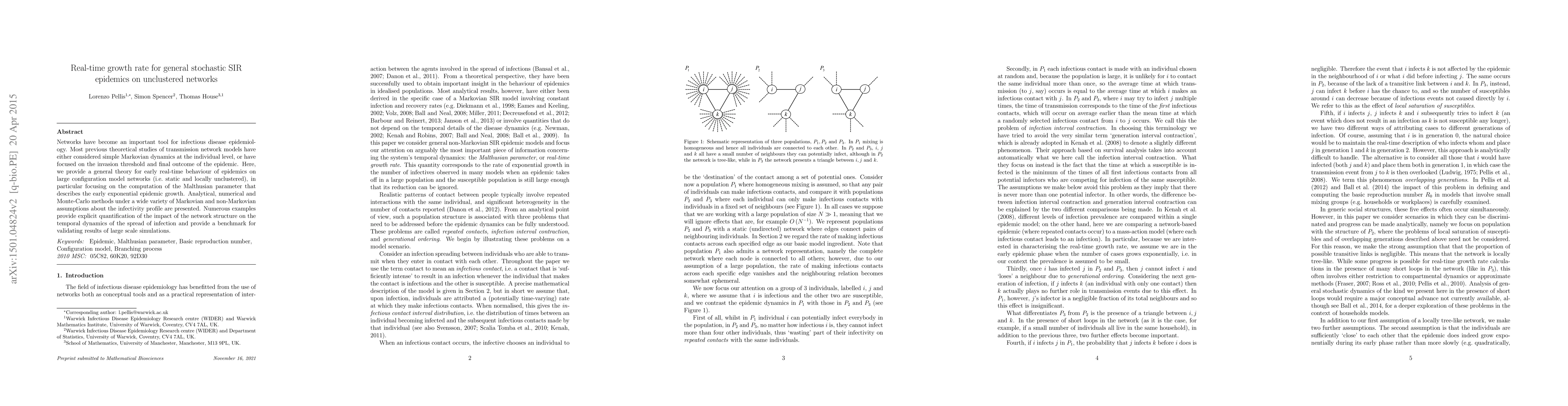 This paper develops a comprehensive theory for the early real-time growth rate of stochastic SIR epidemics on large unclustered networks, focusing on the Malthusian parameter for exponential growth. It employs analytical, numerical, and Monte-Carlo methods under various Markovian and non-Markovian infectivity profiles to quantify the network's impact on infection spread dynamics.