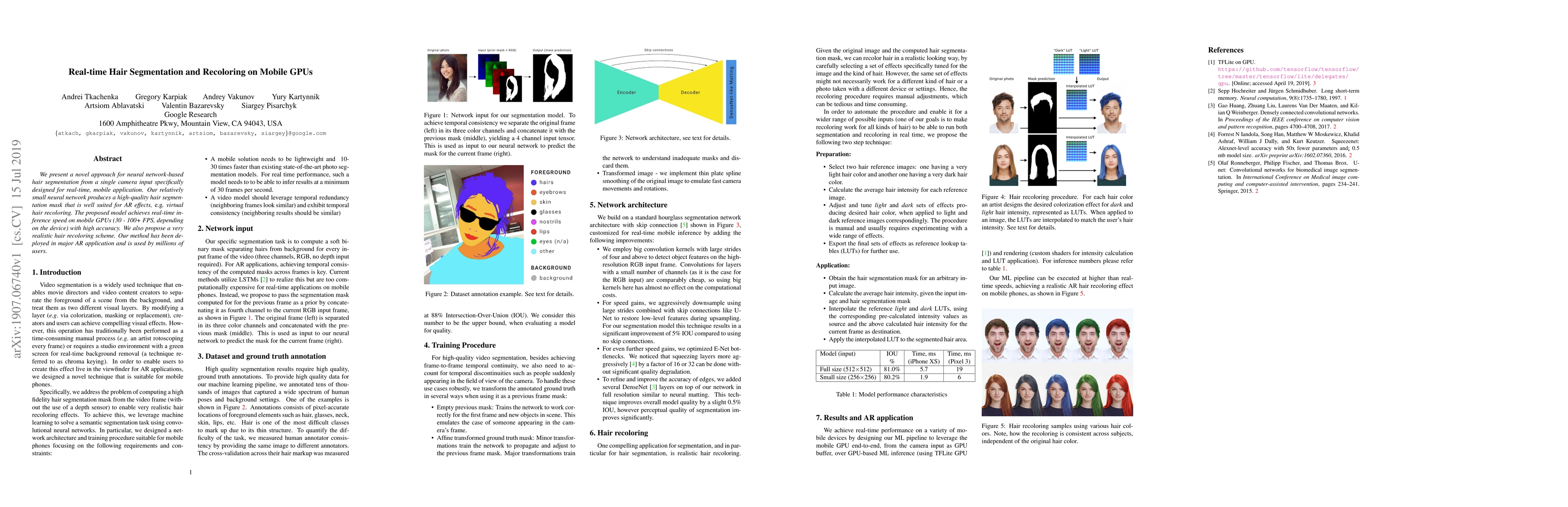 This paper introduces a neural network for real-time hair segmentation on mobile GPUs, achieving high-quality masks suitable for augmented reality effects like virtual hair recoloring, with speeds of 30-100+ FPS. The method has been deployed in a major AR app and is used by millions.