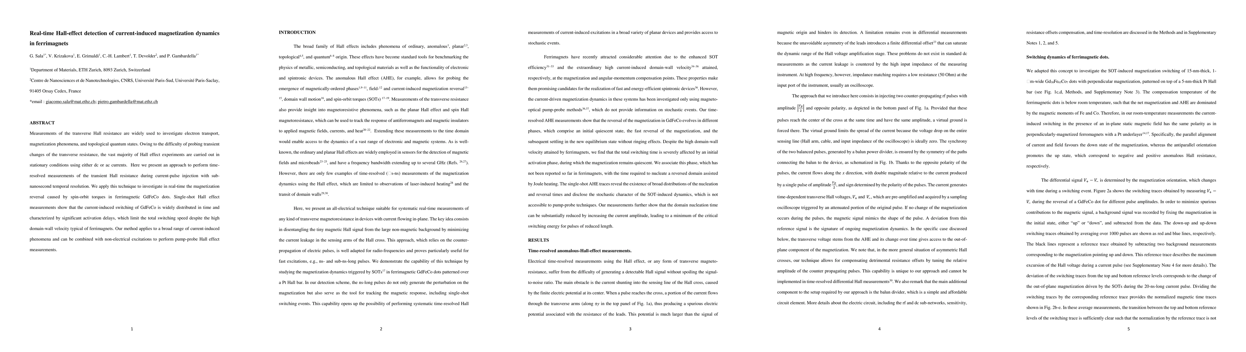 This paper presents a method for real-time Hall-effect detection of transient magnetization dynamics in ferrimagnets using sub-nanosecond resolution during current-pulse injection. The study reveals significant activation delays in the current-induced switching of GdFeCo, limiting the switching speed despite high domain-wall velocity.