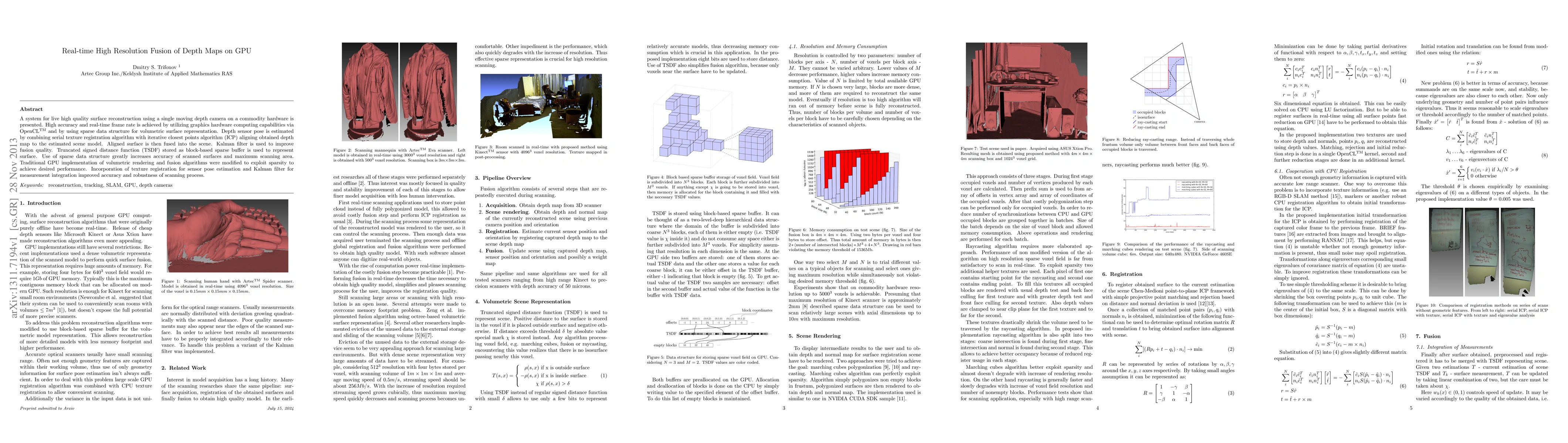 This paper presents a system for real-time high-resolution surface reconstruction using a single moving depth camera on commodity hardware, leveraging GPU computing with OpenCL and sparse data structures. It employs a Kalman filter and Truncated Signed Distance Function for improved fusion quality and accuracy.