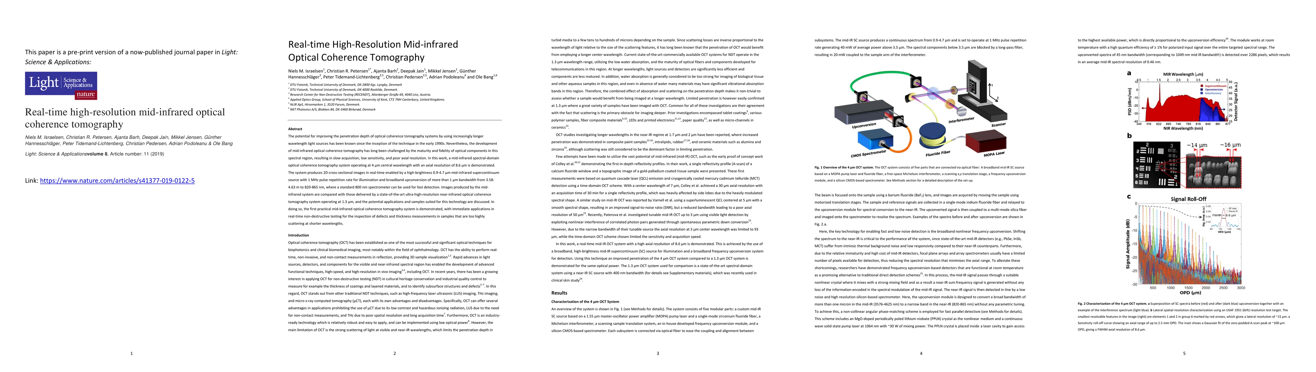 This paper presents a real-time high-resolution mid-infrared optical coherence tomography system operating at 4 microns, achieving 8.6 microns axial resolution and 2D cross-sectional imaging with a 1 MHz pulse rate. The system uses a mid-infrared supercontinuum source and broadband upconversion for enhanced detection, showing potential for non-destructive testing and defect inspection.