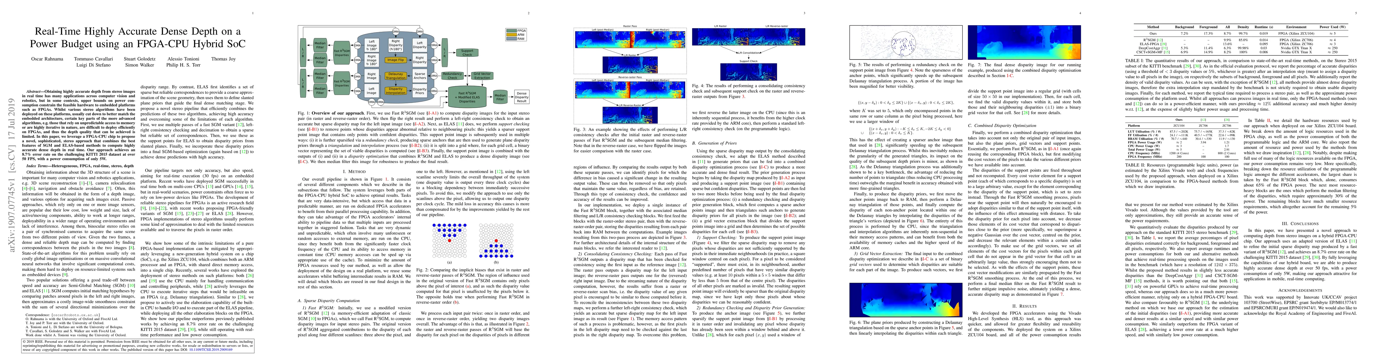 Obtaining highly accurate depth from stereo images in real time has many applications across computer vision and robotics, but in some contexts, upper bounds on power consumption constrain the feasible hardware to embedded platforms such as FPGAs. Whilst various stereo algorithms have been deployed on these platforms, usually cut down to better match the embedded architecture, certain key parts of the more advanced algorithms, e.g. those that rely on unpredictable access to memory or are highly iterative in nature, are difficult to deploy efficiently on FPGAs, and thus the depth quality that can be achieved is limited. In this paper, we leverage a FPGA-CPU chip to propose a novel, sophisticated, stereo approach that combines the best features of SGM and ELAS-based methods to compute highly accurate dense depth in real time. Our approach achieves an 8.7% error rate on the challenging KITTI 2015 dataset at over 50 FPS, with a power consumption of only 5W.