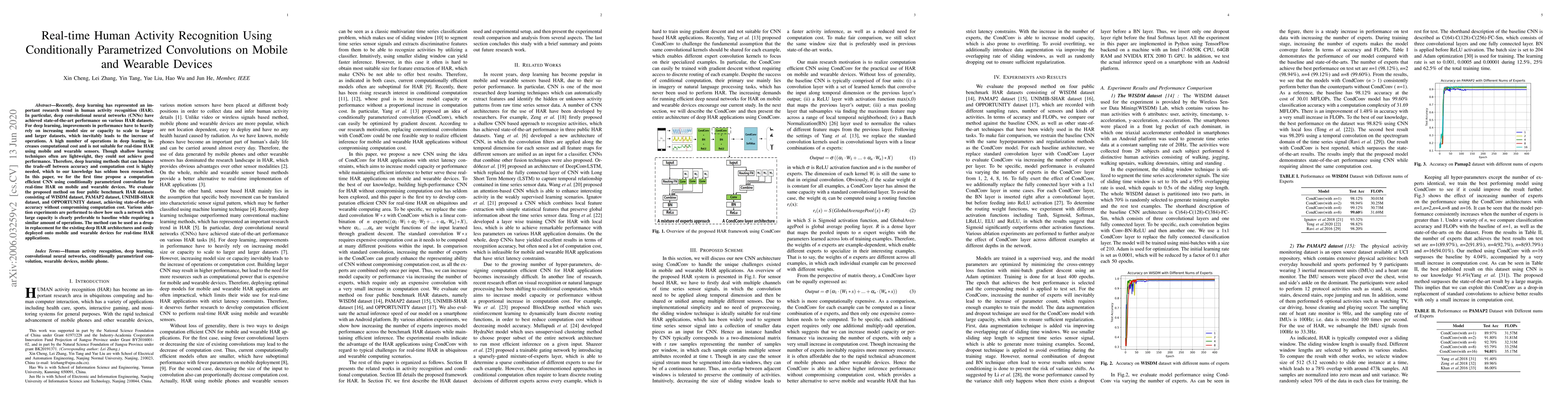 This paper proposes a computation-efficient CNN with conditionally parametrized convolutions for real-time human activity recognition on mobile and wearable devices, achieving state-of-the-art accuracy while balancing accuracy and computational cost. The method outperforms baselines with similar operational requirements and is suitable for deployment in real-time applications.
