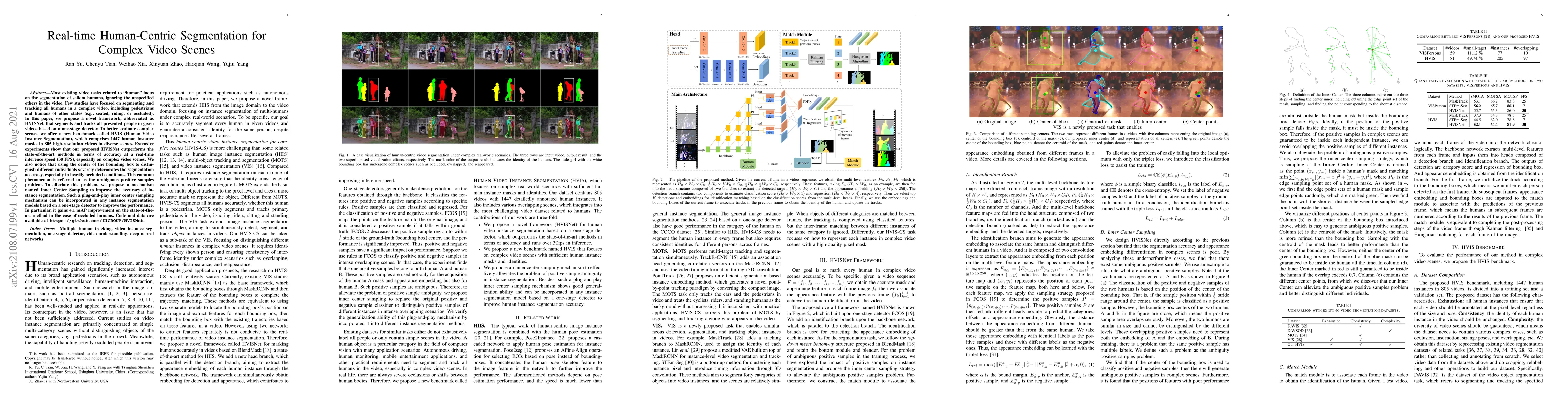 This paper introduces HVISNet, a novel framework for real-time human-centric segmentation and tracking in complex video scenes, addressing the challenge of segmenting all humans regardless of their state. The authors propose a new benchmark, HVIS, and demonstrate that HVISNet outperforms existing methods, achieving 30 FPS while solving the ambiguous positive samples problem with an Inner Center Sampling mechanism.