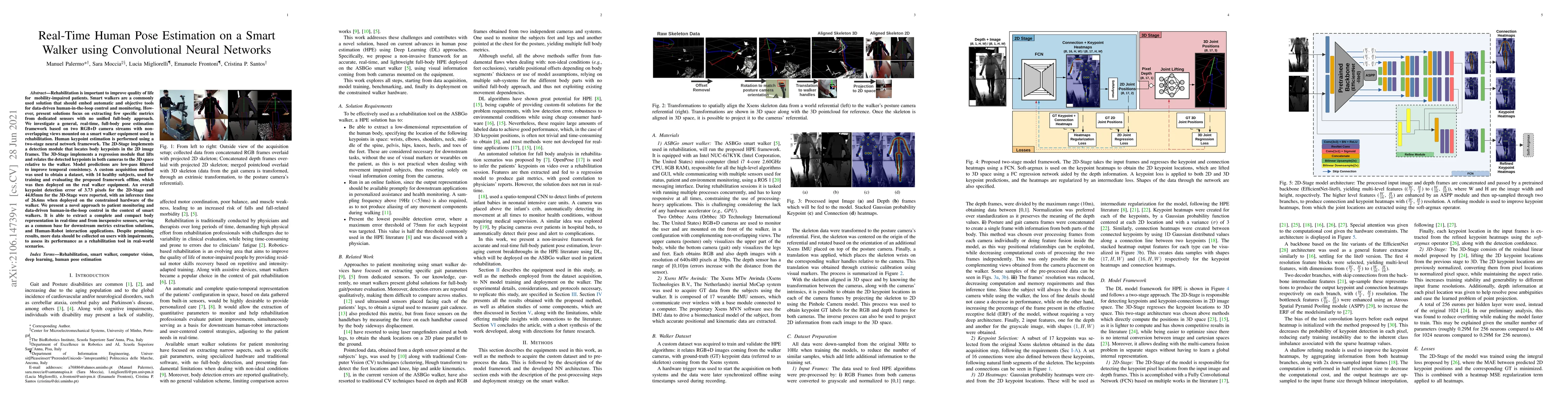 This paper proposes a real-time human pose estimation framework using convolutional neural networks on a smart walker, integrating two RGB+D cameras for full-body 2D-3D keypoint detection. The system demonstrates real-time performance with low error rates and is intended to enhance rehabilitation monitoring and human-robot interaction.