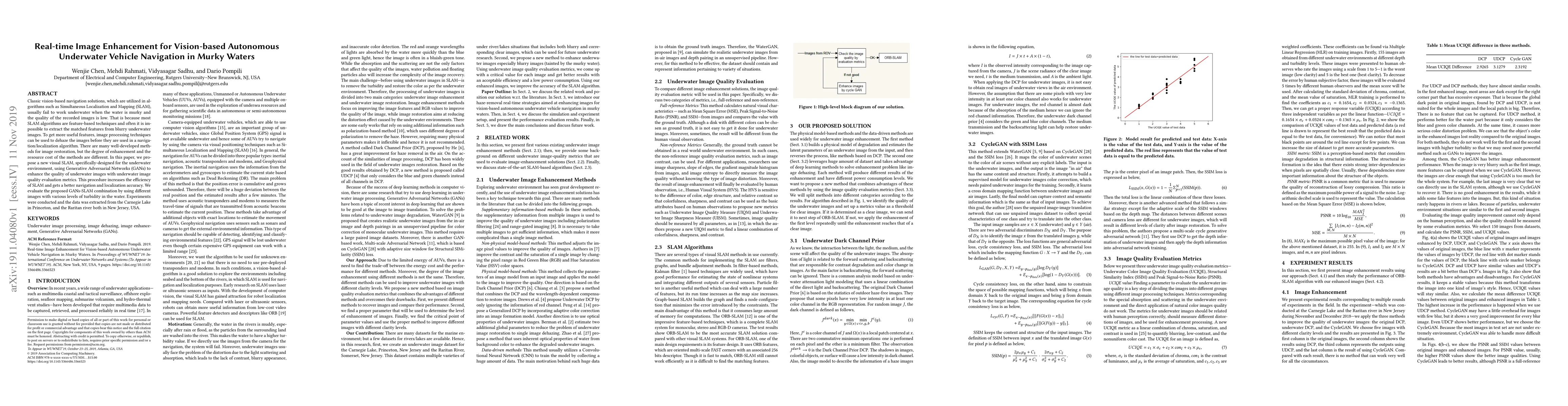 Classic vision-based navigation solutions, which are utilized in algorithms such as Simultaneous Localization and Mapping (SLAM), usually fail to work underwater when the water is murky and the quality of the recorded images is low. That is because most SLAM algorithms are feature-based techniques and often it is impossible to extract the matched features from blurry underwater images. To get more useful features, image processing techniques can be used to dehaze the images before they are used in a navigation/localization algorithm. There are many well-developed methods for image restoration, but the degree of enhancement and the resource cost of the methods are different. In this paper, we propose a new visual SLAM, specifically-designed for the underwater environment, using Generative Adversarial Networks (GANs) to enhance the quality of underwater images with underwater image quality evaluation metrics. This procedure increases the efficiency of SLAM and gets a better navigation and localization accuracy. We evaluate the proposed GANs-SLAM combination by using different images with various levels of turbidity in the water. Experiments were conducted and the data was extracted from the Carnegie Lake in Princeton, and the Raritan river both in New Jersey, USA.