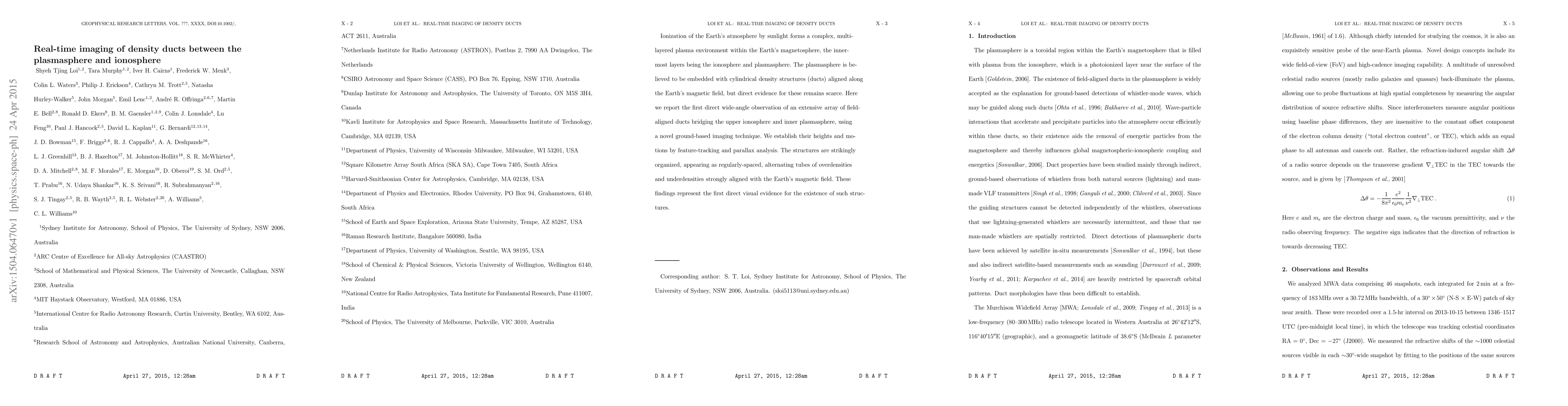 This paper reports the first direct observation of field-aligned density ducts between the Earth's plasmasphere and ionosphere using a novel ground-based imaging technique. The study reveals regularly-spaced, magnetic field-aligned structures of overdensities and underdensities, providing visual evidence for their existence.