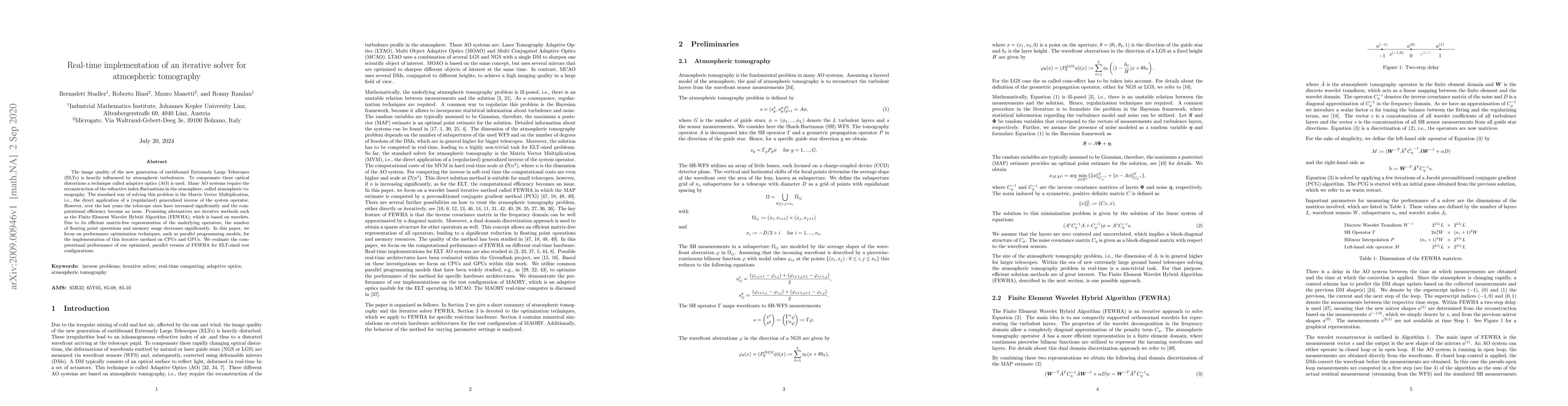 The image quality of the new generation of earthbound Extremely Large Telescopes (ELTs) is heavily influenced by atmospheric turbulences. To compensate these optical distortions a technique called adaptive optics (AO) is used. Many AO systems require the reconstruction of the refractive index fluctuations in the atmosphere, called atmospheric tomography. The standard way of solving this problem is the Matrix Vector Multiplication, i.e., the direct application of a (regularized) generalized inverse of the system operator. However, over the last years the telescope sizes have increased significantly and the computational efficiency become an issue. Promising alternatives are iterative methods such as the Finite Element Wavelet Hybrid Algorithm (FEWHA), which is based on wavelets. Due to its efficient matrix-free representation of the underlying operators, the number of floating point operations and memory usage decreases significantly. In this paper, we focus on performance optimization techniques, such as parallel programming models, for the implementation of this iterative method on CPUs and GPUs. We evaluate the computational performance of our optimized, parallel version of FEWHA for ELT-sized test configurations.