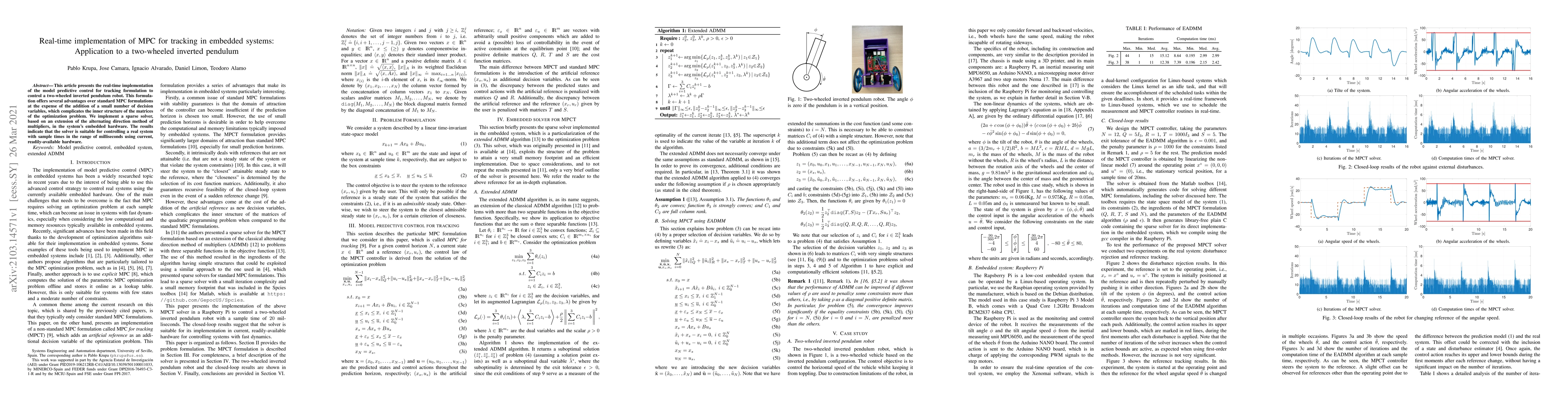 This article presents the real-time implementation of the model predictive control for tracking formulation to control a two-wheeled inverted pendulum robot. This formulation offers several advantages over standard MPC formulations at the expense of the addition of a small number of decision variables, which complicates the inner structure of the matrices of the optimization problem. We implement a sparse solver, based on an extension of the alternating direction method of multipliers, in the system's embedded hardware. The results indicate that the solver is suitable for controlling a real system with sample times in the range of milliseconds using current, readily-available hardware.