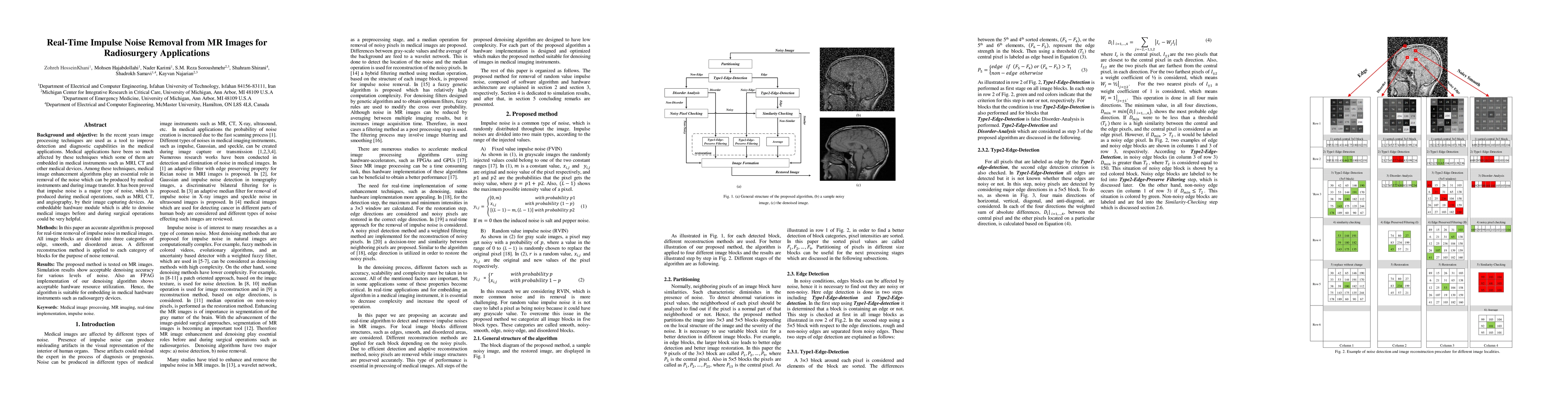 In the recent years image processing techniques are used as a tool to improve detection and diagnostic capabilities in the medical applications. Medical applications have been so much affected by these techniques which some of them are embedded in medical instruments such as MRI, CT and other medical devices. Among these techniques, medical image enhancement algorithms play an essential role in removal of the noise which can be produced by medical instruments and during image transfer. It has been proved that impulse noise is a major type of noise, which is produced during medical operations, such as MRI, CT, and angiography, by their image capturing devices. An embeddable hardware module which is able to denoise medical images before and during surgical operations could be very helpful. In this paper an accurate algorithm is proposed for real-time removal of impulse noise in medical images. All image blocks are divided into three categories of edge, smooth, and disordered areas. A different reconstruction method is applied to each category of blocks for the purpose of noise removal. The proposed method is tested on MR images. Simulation results show acceptable denoising accuracy for various levels of noise. Also an FPAG implementation of our denoising algorithm shows acceptable hardware resource utilization. Hence, the algorithm is suitable for embedding in medical hardware instruments such as radiosurgery devices.