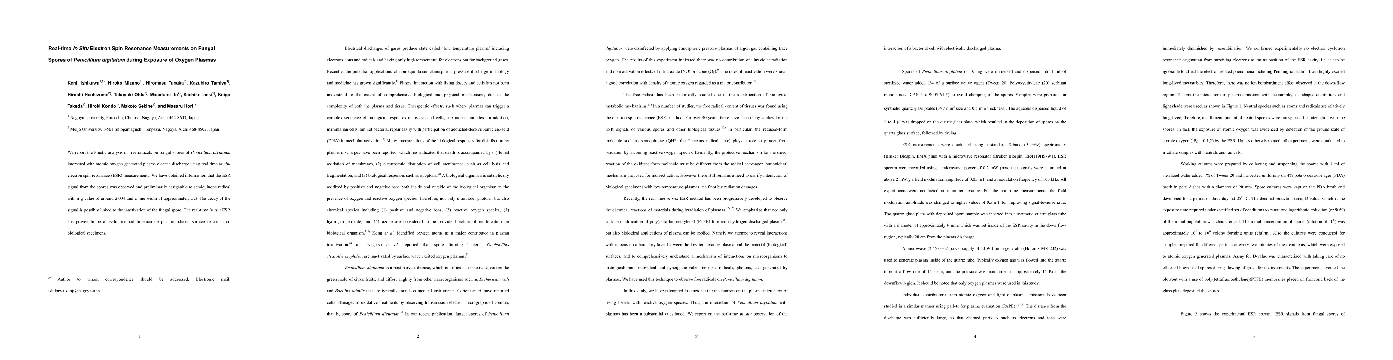 We report the kinetic analysis of free radicals on fungal spores of Penicillium digitatum interacted with atomic oxygen generated plasma electric discharge using real time in situ electron spin resonance (ESR) measurements. We have obtained information that the ESR signal from the spores was observed and preliminarily assignable to semiquinone radical with a g-value of around 2.004 and a line width of approximately 5G. The decay of the signal is possibly linked to the inactivation of the fungal spore. The real-time in situ ESR has proven to be a useful method to elucidate plasma-induced surface reactions on biological specimens.
