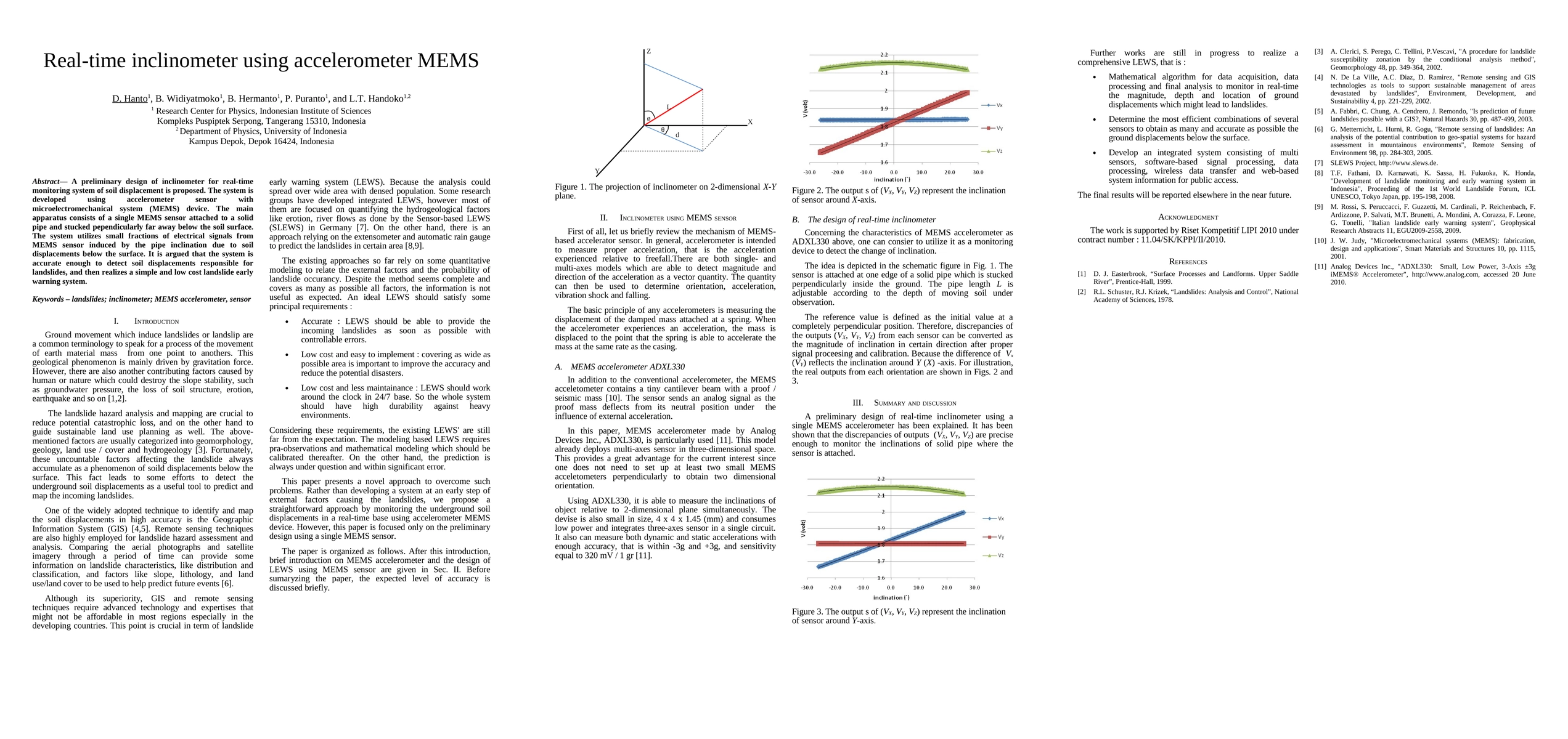 This work is novel because it proposes a straightforward approach by monitoring underground soil displacements using accelerometer MEMS device, rather than developing a system at an early step of external factors causing landslides.