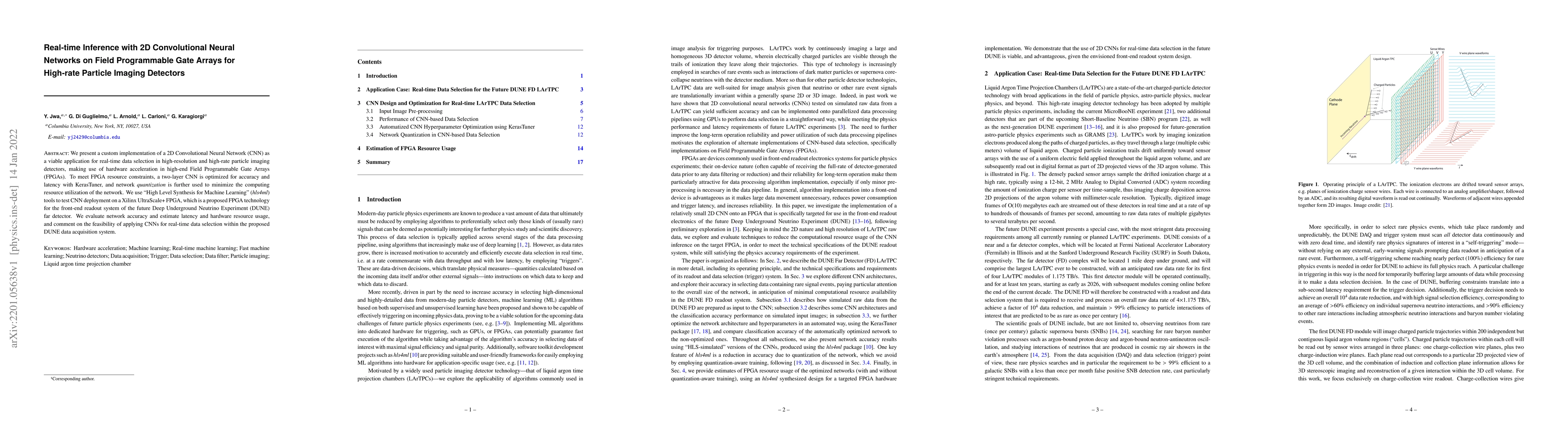 This paper explores a custom 2D Convolutional Neural Network (CNN) implementation on FPGAs for real-time data selection in high-rate particle imaging detectors, optimizing a two-layer CNN for accuracy and latency using KerasTuner and quantization. The feasibility of applying CNNs in the DUNE experiment's front-end readout system is evaluated through hardware resource usage and latency estimation.