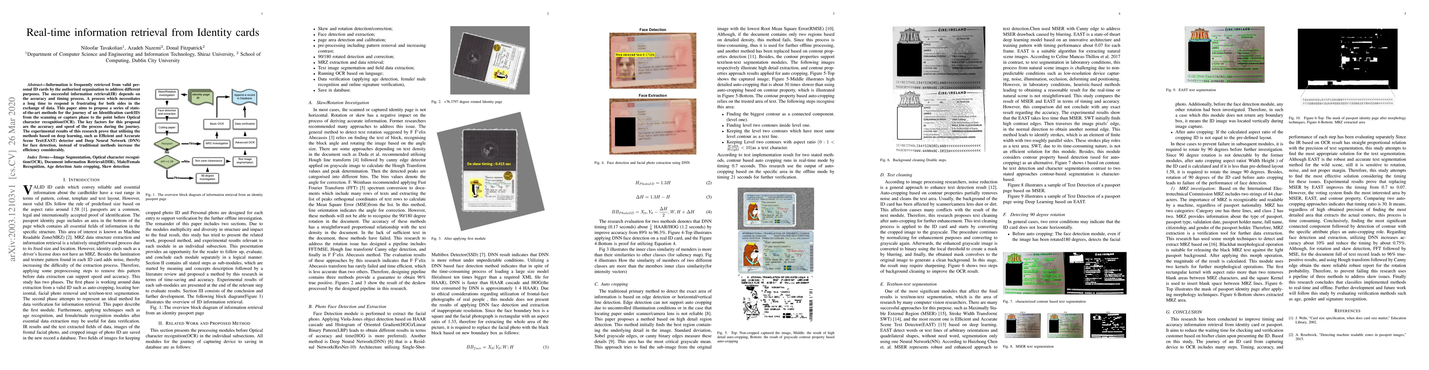 Information is frequently retrieved from valid personal ID cards by the authorised organisation to address different purposes. The successful information retrieval (IR) depends on the accuracy and timing process. A process which necessitates a long time to respond is frustrating for both sides in the exchange of data. This paper aims to propose a series of state-of-the-art methods for the journey of an Identification card (ID) from the scanning or capture phase to the point before Optical character recognition (OCR). The key factors for this proposal are the accuracy and speed of the process during the journey. The experimental results of this research prove that utilising the methods based on deep learning, such as Efficient and Accurate Scene Text (EAST) detector and Deep Neural Network (DNN) for face detection, instead of traditional methods increase the efficiency considerably.