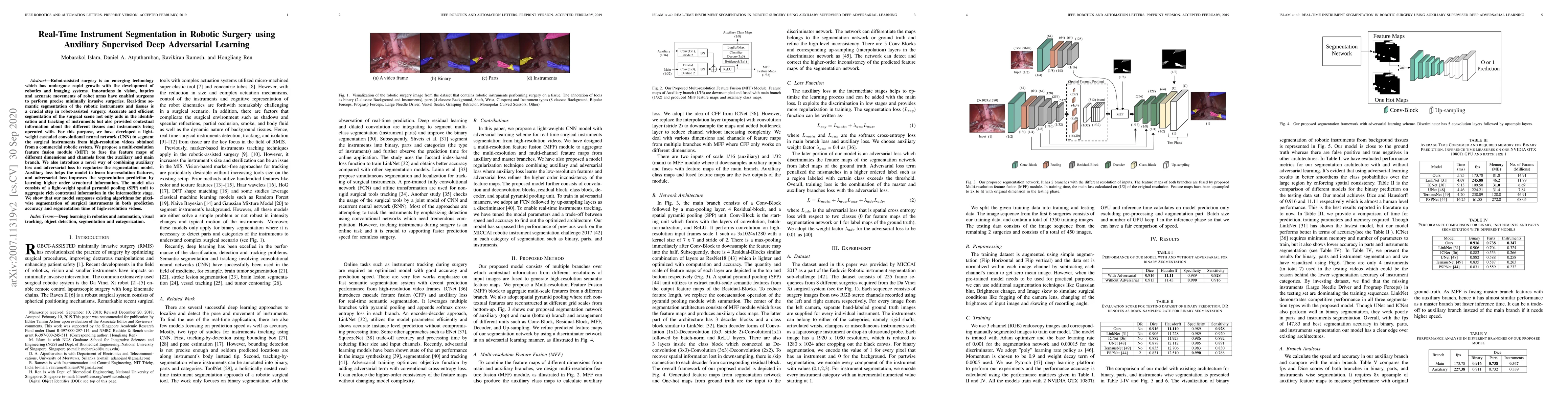 This paper presents a lightweight cascaded CNN with a multi-resolution feature fusion module and a spatial pyramid pooling unit for real-time segmentation of robotic instruments in surgery. The model combines auxiliary and adversarial losses to enhance segmentation accuracy and efficiency, outperforming existing algorithms.