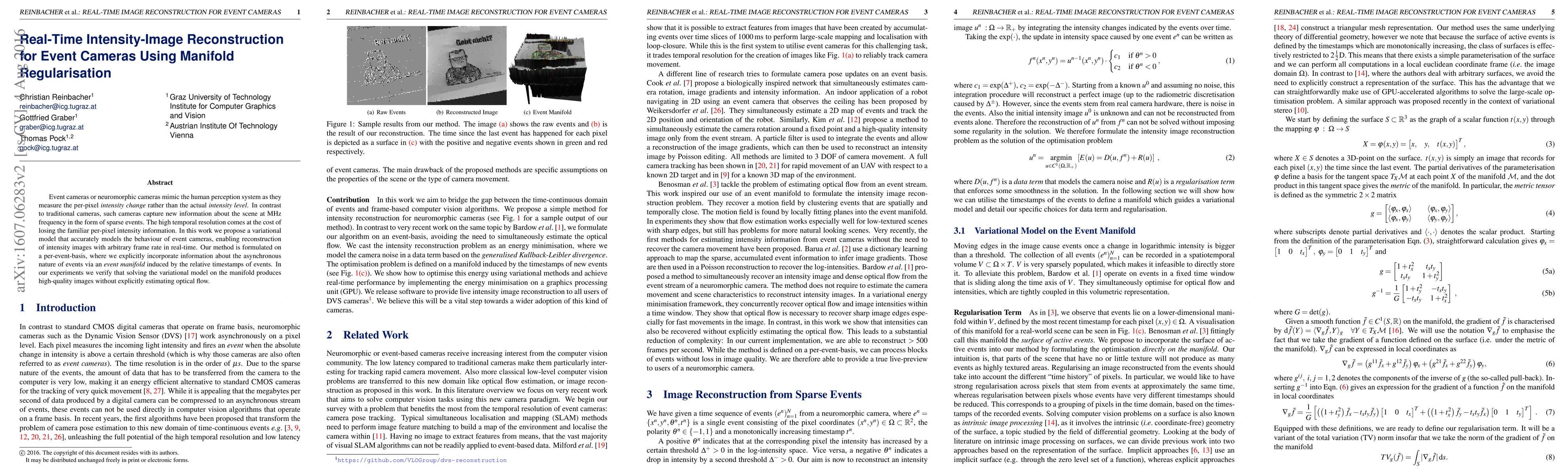 This paper proposes a variational model for real-time intensity-image reconstruction from event cameras using manifold regularisation. It leverages the asynchronous nature of event data through an event manifold, achieving high-quality image reconstruction without optical flow estimation.