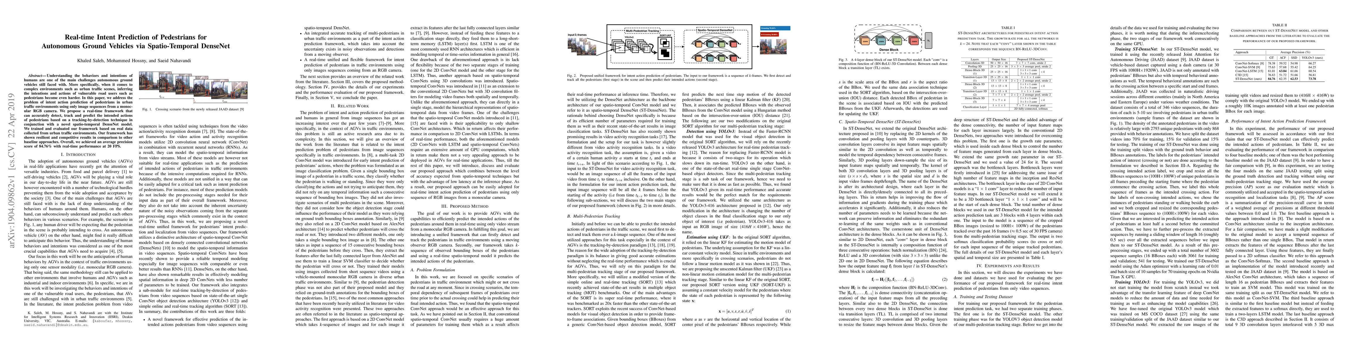This paper proposes a real-time framework for predicting pedestrian intentions using a spatio-temporal DenseNet model integrated with a tracking-by-detection technique. The framework achieved an average precision of 84.76% and operates at 20 FPS, demonstrating competitive performance in urban traffic scenarios.
