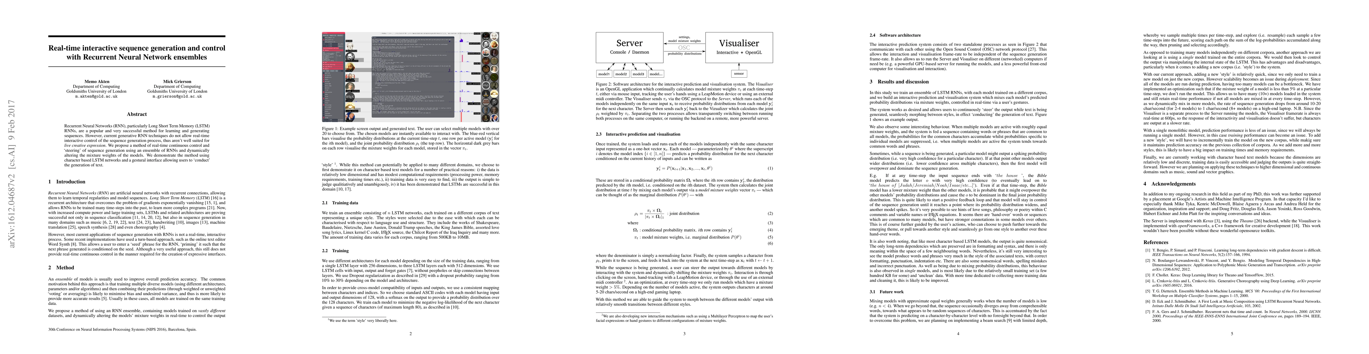 This paper proposes a method for real-time interactive control of sequence generation using an ensemble of LSTM RNNs, enabling dynamic alteration of model mixture weights. It demonstrates this technique with character-based LSTM networks and a gestural interface for live creative expression.