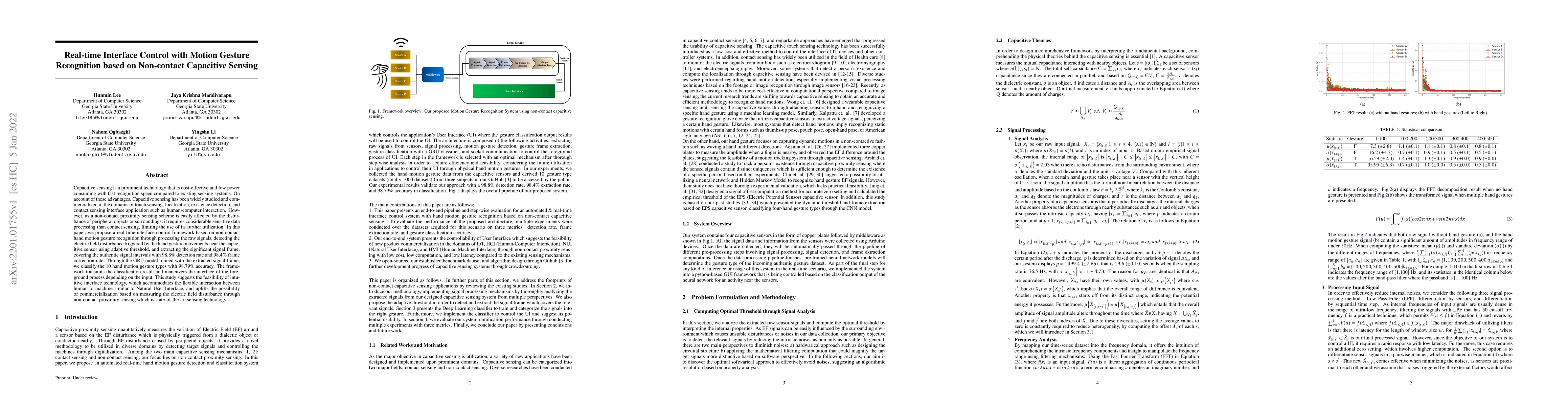 A non-contact capacitive sensing system recognizes hand motion gestures with 98.8% detection rate and 98.4% frame correction rate, enabling real-time interface control.