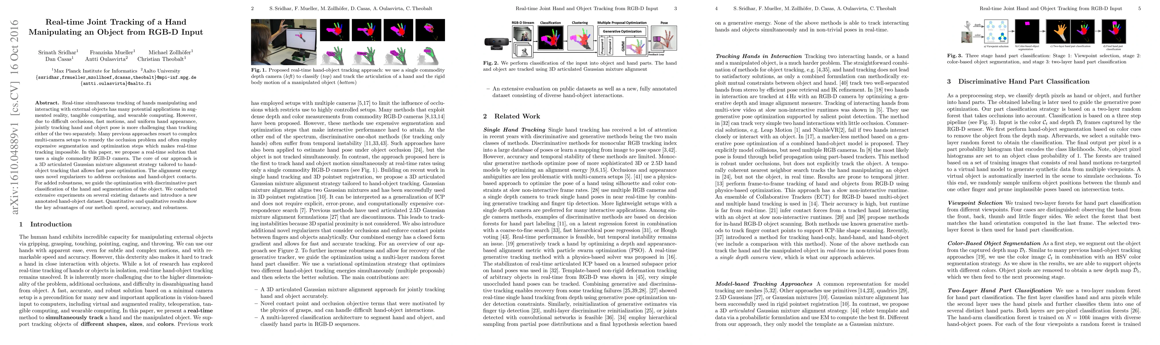 This paper proposes a real-time solution for tracking hands and objects using a single RGB-D camera, employing a 3D articulated Gaussian mixture alignment strategy. The method is robust to occlusions and fast motions, achieving high speed, accuracy, and robustness through novel regularizers and part classification.