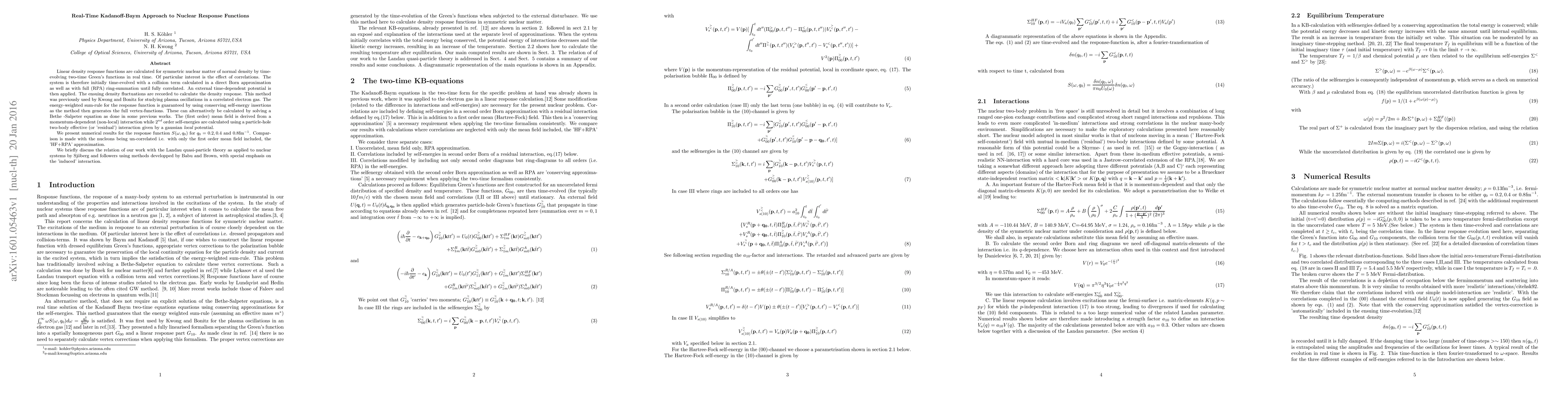 Linear density response functions are calculated for symmetric nuclear matter of normal density by time-evolving two-time Green's functions in real time. Of particular interest is the effect of correlations. The system is therefore initially time-evolved with a collision term calculated in a direct Born approximation as well as with full (RPA) ring-summation until fully correlated. An external time-dependent potential is then applied. The ensuing density fluctuations are recorded to calculate the density response. This method was previously used by Kwong and Bonitz for studying plasma oscillations in a correlated electron gas. The energy-weighted sum-rule for the response function is guaranteed by using conserving self-energy insertions as the method then generates the full vertex-functions. These can alternatively be calculated by solving a Bethe -Salpeter equation as done in some previous works. The (first order) mean field is derived from a momentum-dependent (non-local) interaction while $2^{nd}$ order self-energies are calculated using a particle-hole two-body effective (or 'residual') interaction given by a gaussian \it local \rm potential. We present numerical results for the response function $S(\omega,q_0)$ for $q_0=0.2,0.4$ and $0.8 {\rm fm}^{-1}$. Comparison is made with the nucleons being un-correlated i.e. with only the first order mean field included, the 'HF+RPA' approximation. We briefly discuss the relation of our work with the Landau quasi-particle theory as applied to nuclear systems by Sj\"oberg and followers using methods developped by Babu and Brown, with special emphasis on the 'induced' interaction.