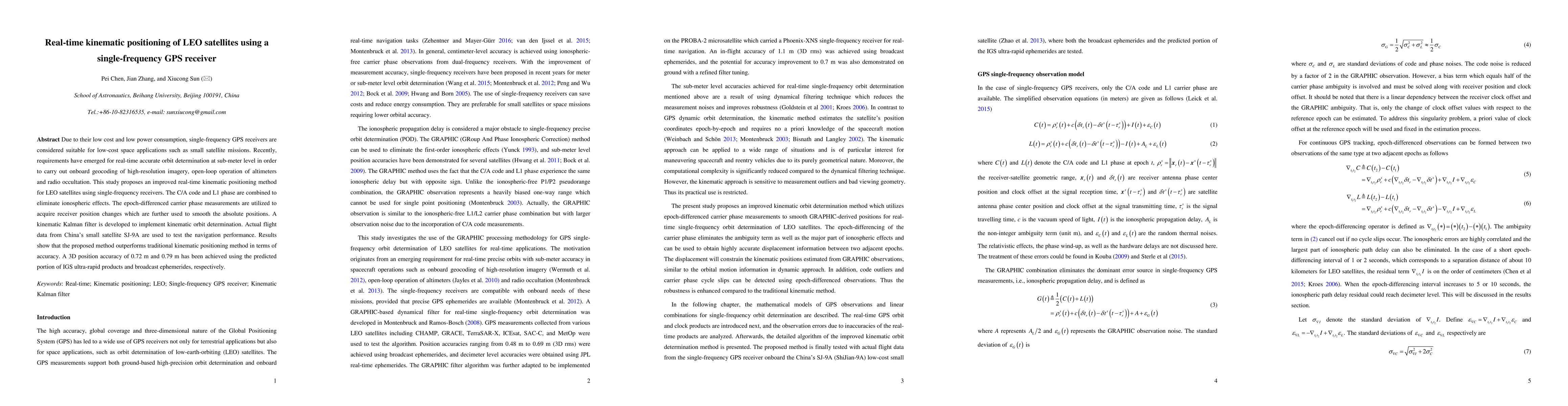 This study proposes an improved real-time kinematic positioning method for low Earth orbit (LEO) satellites using single-frequency GPS receivers, which combines C/A code and L1 phase to eliminate ionospheric effects. The method achieves a 3D position accuracy of 0.72 m and 0.79 m, outperforming traditional methods.