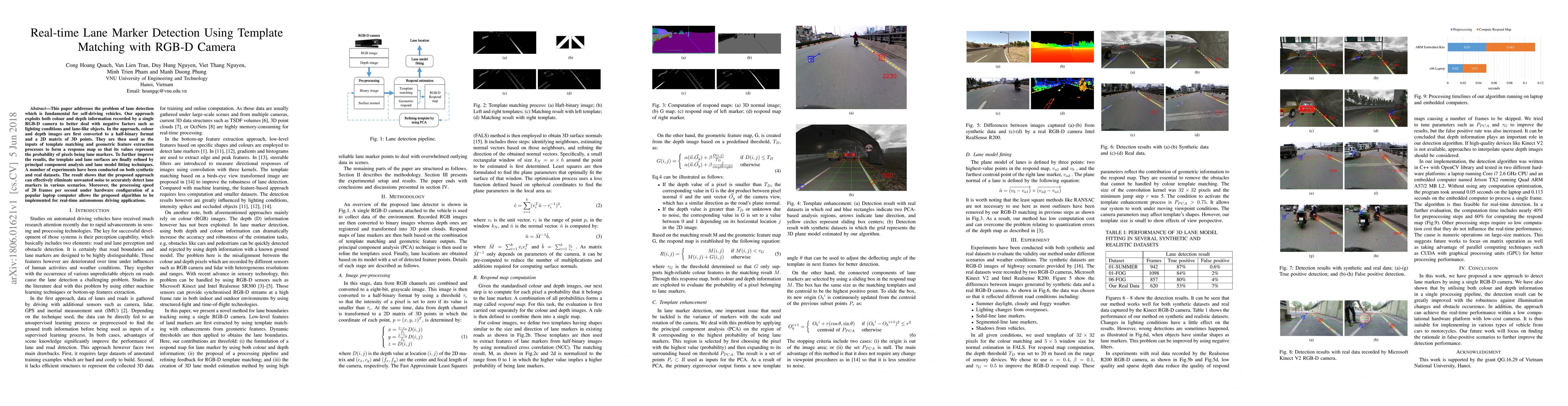 This paper proposes a real-time lane detection method using template matching with an RGB-D camera, combining color and depth information to enhance accuracy under varying conditions. The approach achieves 20 frames per second processing speed, suitable for real-time autonomous driving applications.