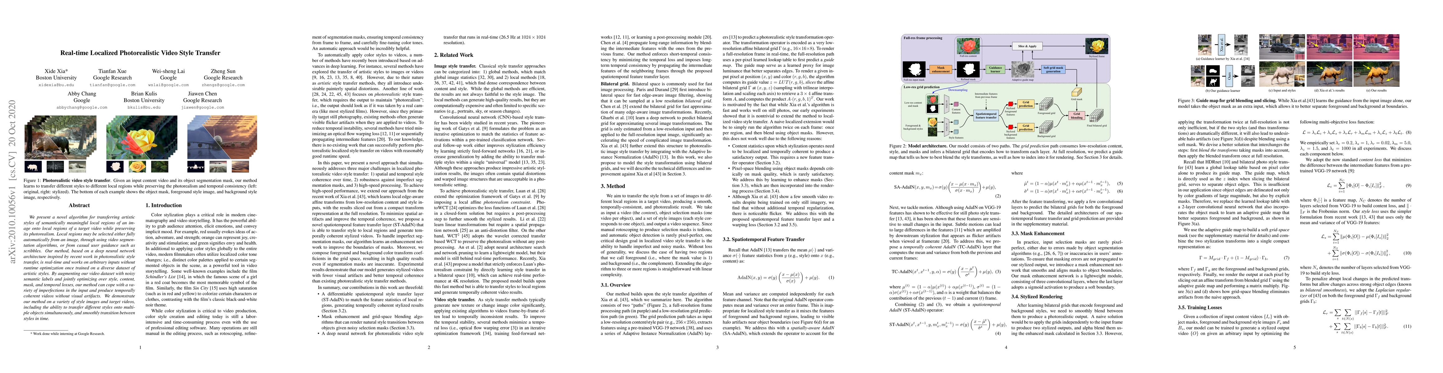 This paper introduces a real-time, localized algorithm for transferring artistic styles to specific regions of a target video while maintaining photorealism. The method leverages deep neural networks and can handle automatic or user-guided region selection, producing temporally coherent results without visual artifacts.