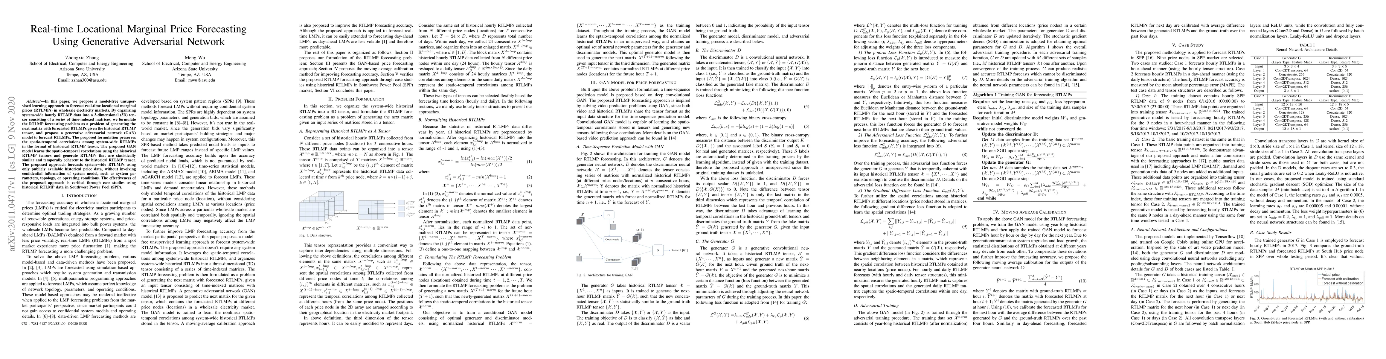 This paper proposes a model-free, unsupervised learning approach using a generative adversarial network (GAN) to forecast real-time locational marginal prices (RTLMPs) in electricity markets. The GAN model learns spatio-temporal correlations from historical RTLMP data to generate accurate forecasts without requiring confidential system information.