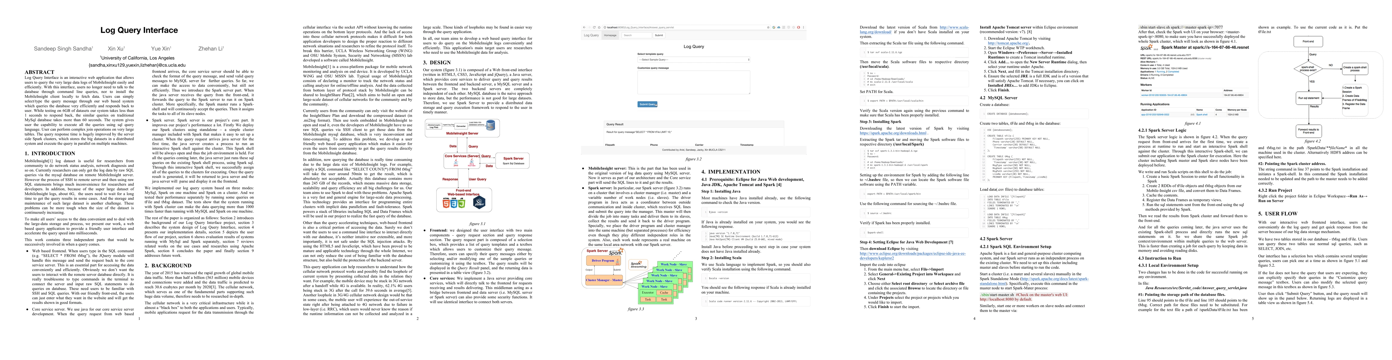 Log Query Interface is an interactive web application that allows users to query the very large data logs of MobileInsight easily and efficiently. With this interface, users no longer need to talk to the database through command line queries, nor to install the MobileInsight client locally to fetch data. Users can simply select/type the query message through our web based system which queries the database very efficiently and responds back to user. While testing on 6GB of datasets our system takes less than 1 seconds to respond back, the similar queries on traditional MySql database takes more than 60 seconds. The system gives user the capability to execute all the queries using sql query language. User can perform complex join operations on very large tables. The query response time is hugely improved by the server side Spark clusters, which stores the big datasets in a distributed system and execute the query in parallel on multiple machines.