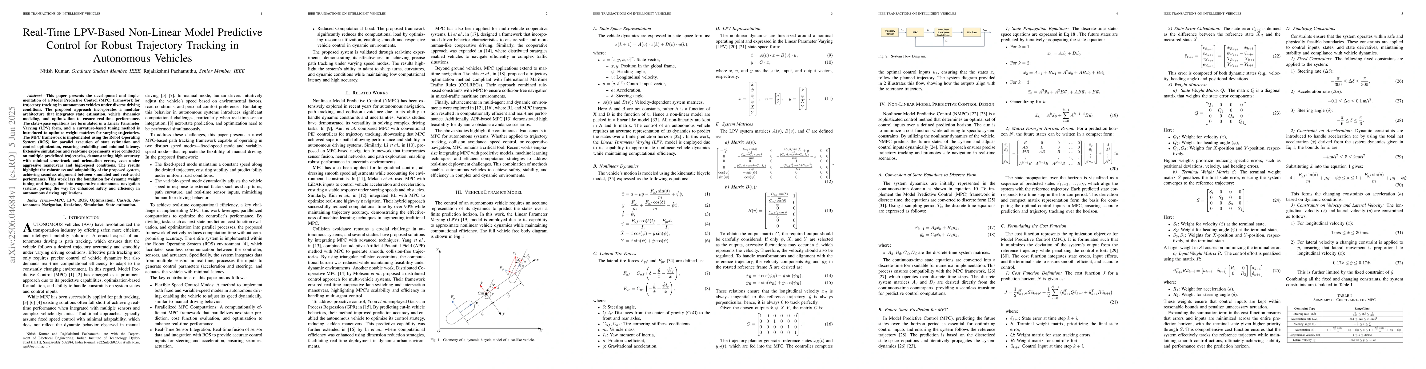 The paper presents an LPV-based non-linear MPC framework with curvature-tuned weight matrices for real-time trajectory tracking in autonomous vehicles.