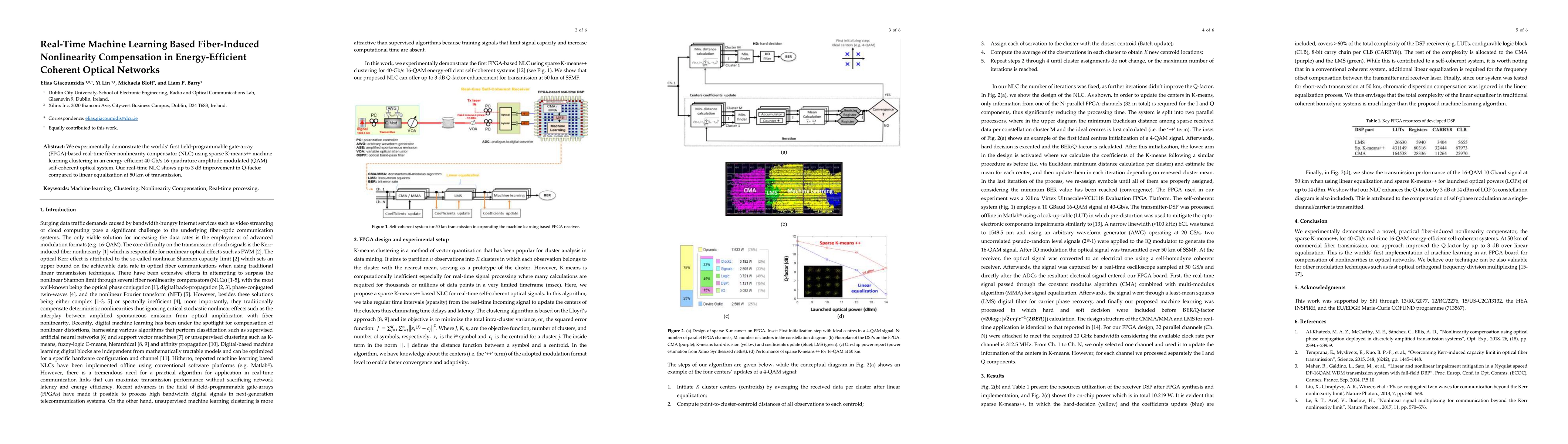 This paper presents a real-time FPGA-based fiber nonlinearity compensator utilizing sparse K-means++ machine learning for an energy-efficient 40-Gb/s optical network, achieving a 3 dB Q-factor improvement over linear equalization after 50 km transmission.