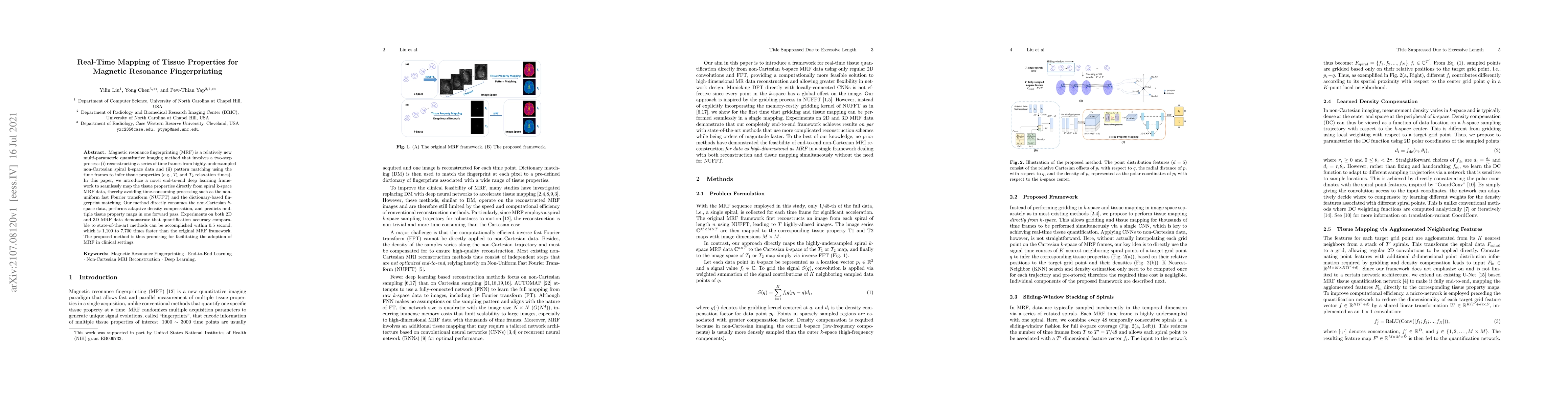 Magnetic resonance Fingerprinting (MRF) is a relatively new multi-parametric quantitative imaging method that involves a two-step process: (i) reconstructing a series of time frames from highly-undersampled non-Cartesian spiral k-space data and (ii) pattern matching using the time frames to infer tissue properties (e.g., T1 and T2 relaxation times). In this paper, we introduce a novel end-to-end deep learning framework to seamlessly map the tissue properties directly from spiral k-space MRF data, thereby avoiding time-consuming processing such as the nonuniform fast Fourier transform (NUFFT) and the dictionary-based Fingerprint matching. Our method directly consumes the non-Cartesian k- space data, performs adaptive density compensation, and predicts multiple tissue property maps in one forward pass. Experiments on both 2D and 3D MRF data demonstrate that quantification accuracy comparable to state-of-the-art methods can be accomplished within 0.5 second, which is 1100 to 7700 times faster than the original MRF framework. The proposed method is thus promising for facilitating the adoption of MRF in clinical settings.