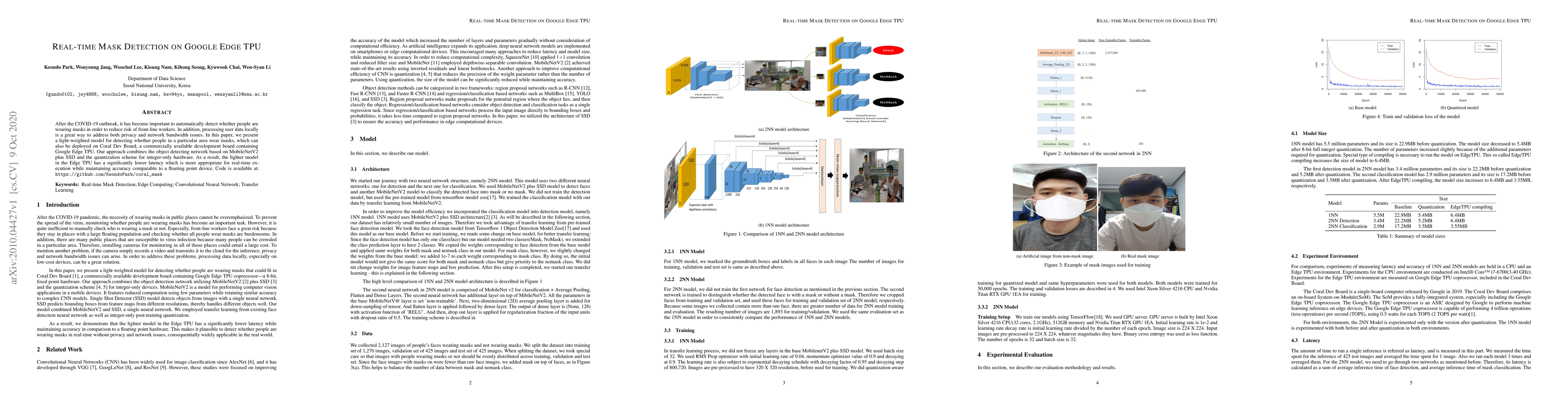 This paper presents a lightweight mask detection model for real-time execution on Google Edge TPU devices, achieving comparable accuracy to floating-point devices while reducing latency.
