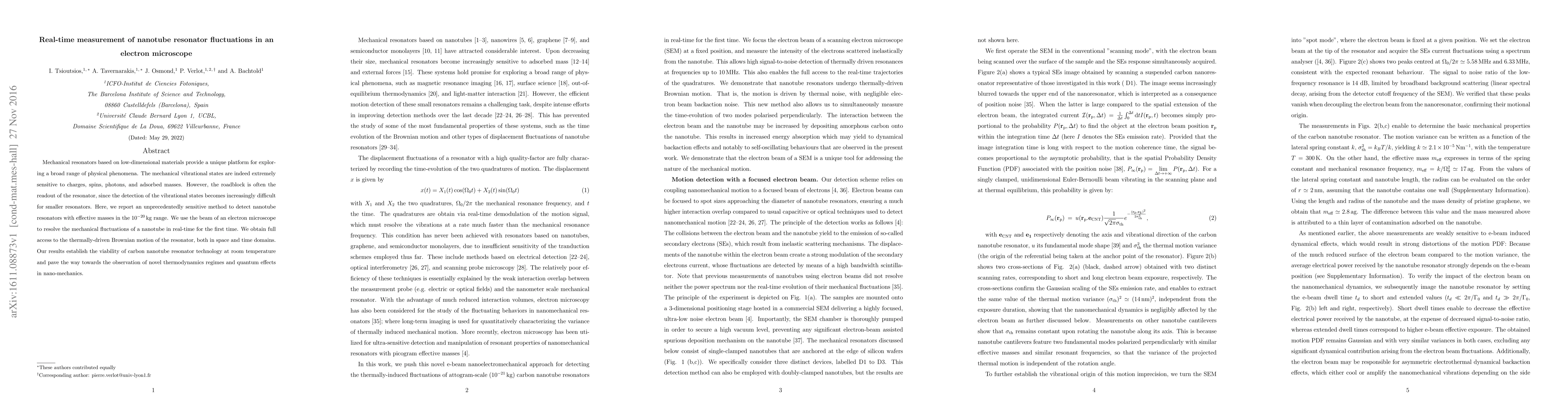 This research introduces a novel method using an electron microscope to real-time monitor nanotube resonator fluctuations, achieving unprecedented sensitivity for detecting vibrational states with effective masses as low as 10^-20 kg. This breakthrough enables the observation of thermal Brownian motion in both space and time domains, opening avenues for studying novel thermodynamics and quantum effects in nanomechanics at room temperature.