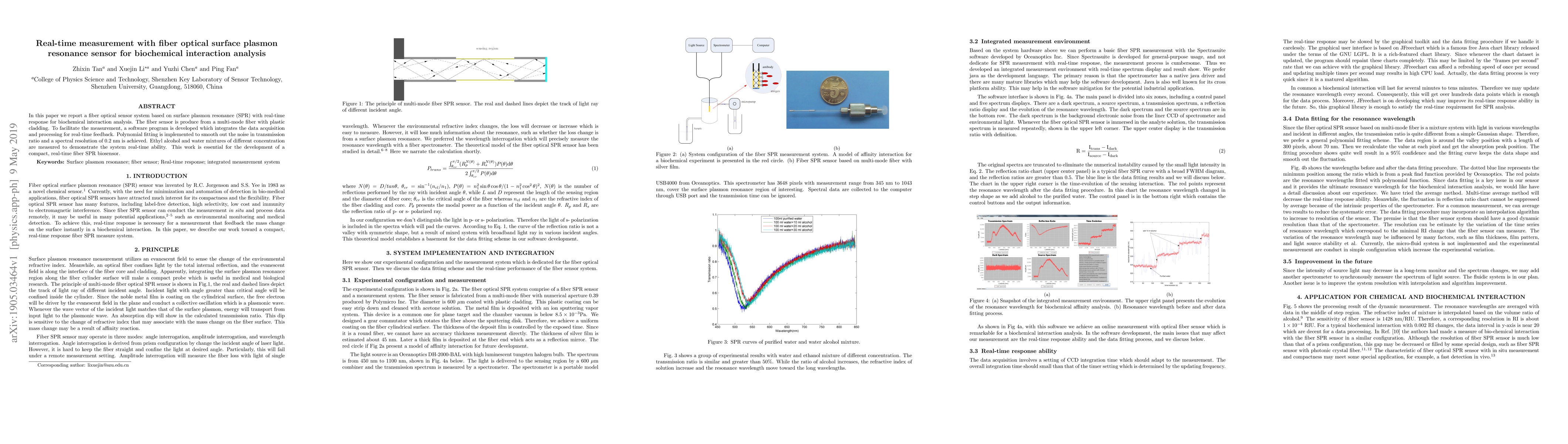In this paper we report a fiber optical sensor system based on surface plasmon resonance (SPR) with real-time response for biochemical interaction analysis. The fiber sensor is constructed from a multi-mode fiber with plastic cladding. To facilitate the measurement, a software program is developed which integrates the data acquisition and processing for real-time feedback. Polynomial fitting is implemented to smooth out the noise in the transmission ratio and a spectral resolution of 0.2 nm is achieved. Ethyl alcohol and water mixtures with different concentrations are measured to demonstrate the system's real-time capability. This work is essential for the development of a compact, real-time fiber SPR biosensor.