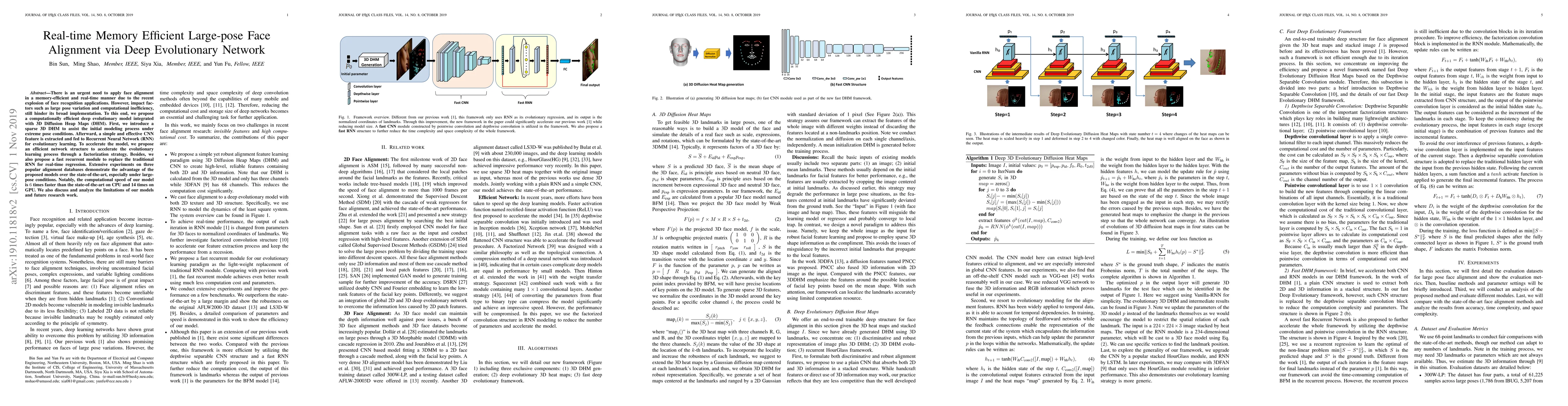 There is an urgent need to apply face alignment in a memory-efficient and real-time manner due to the recent explosion of face recognition applications. However, impact factors such as large pose variation and computational inefficiency, still hinder its broad implementation. To this end, we propose a computationally efficient deep evolutionary model integrated with 3D Diffusion Heap Maps (DHM). First, we introduce a sparse 3D DHM to assist the initial modeling process under extreme pose conditions. Afterward, a simple and effective CNN feature is extracted and fed to Recurrent Neural Network (RNN) for evolutionary learning. To accelerate the model, we propose an efficient network structure to accelerate the evolutionary learning process through a factorization strategy. Extensive experiments on three popular alignment databases demonstrate the advantage of the proposed models over the state-of-the-art, especially under large-pose conditions. Notably, the computational speed of our model is 6 times faster than the state-of-the-art on CPU and 14 times on GPU. We also discuss and analyze the limitations of our models and future research work.