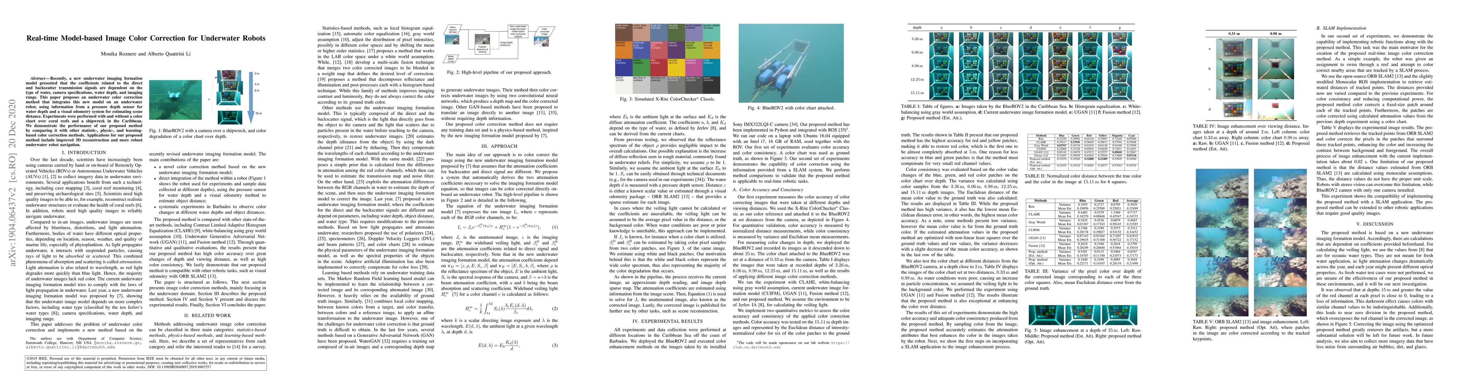 Recently, a new underwater imaging formation model presented that the coefficients related to the direct and backscatter transmission signals are dependent on the type of water, camera specifications, water depth, and imaging range. This paper proposes an underwater color correction method that integrates this new model on an underwater robot, using information from a pressure depth sensor for water depth and a visual odometry system for estimating scene distance. Experiments were performed with and without a color chart over coral reefs and a shipwreck in the Caribbean. We demonstrate the performance of our proposed method by comparing it with other statistic-, physic-, and learning-based color correction methods. Applications for our proposed method include improved 3D reconstruction and more robust underwater robot navigation.