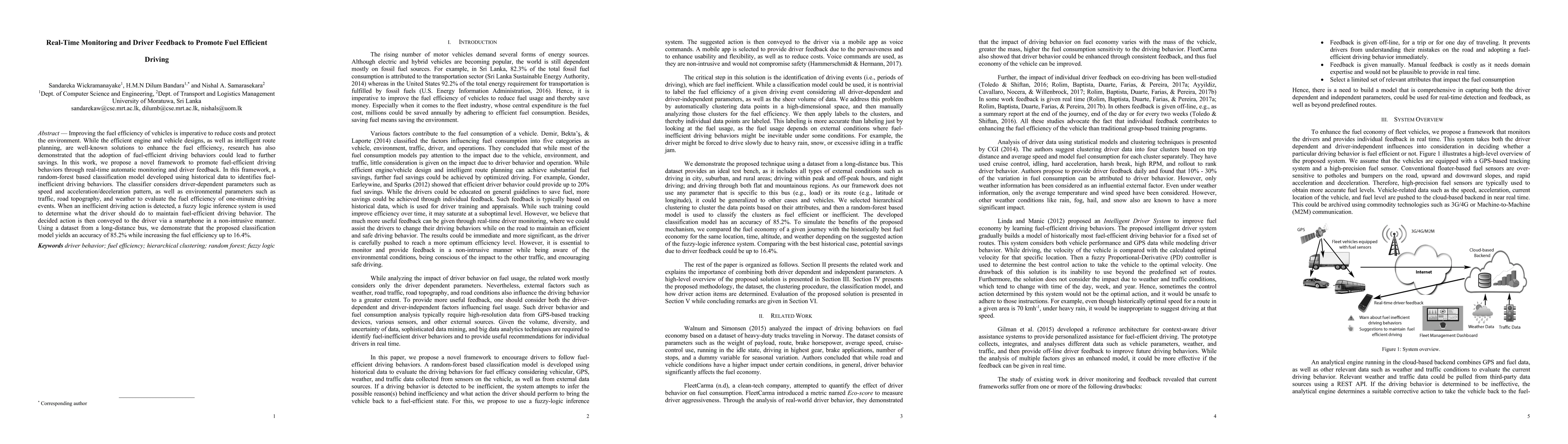 This paper proposes a framework for real-time monitoring and driver feedback to enhance fuel-efficient driving, using a random-forest classifier and fuzzy logic to identify and correct inefficient behaviors. The system increased fuel efficiency by up to 16.4% with an 85.2% accuracy rate.