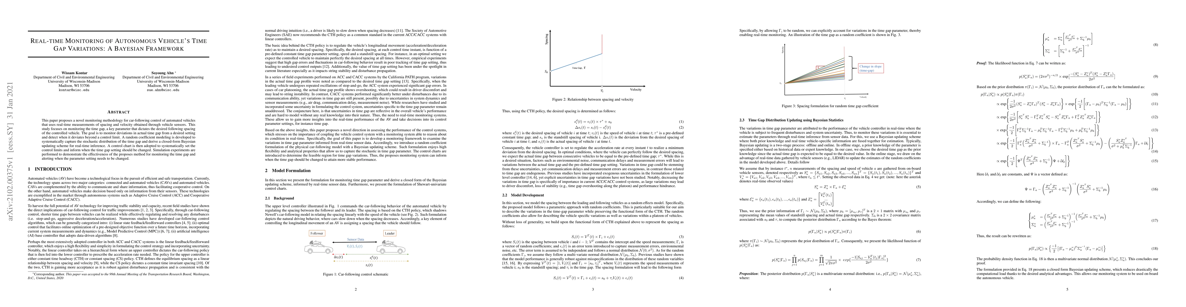 A novel real-time monitoring system for time gap variations in autonomous vehicles is proposed, incorporating random coefficient modeling and control charts.