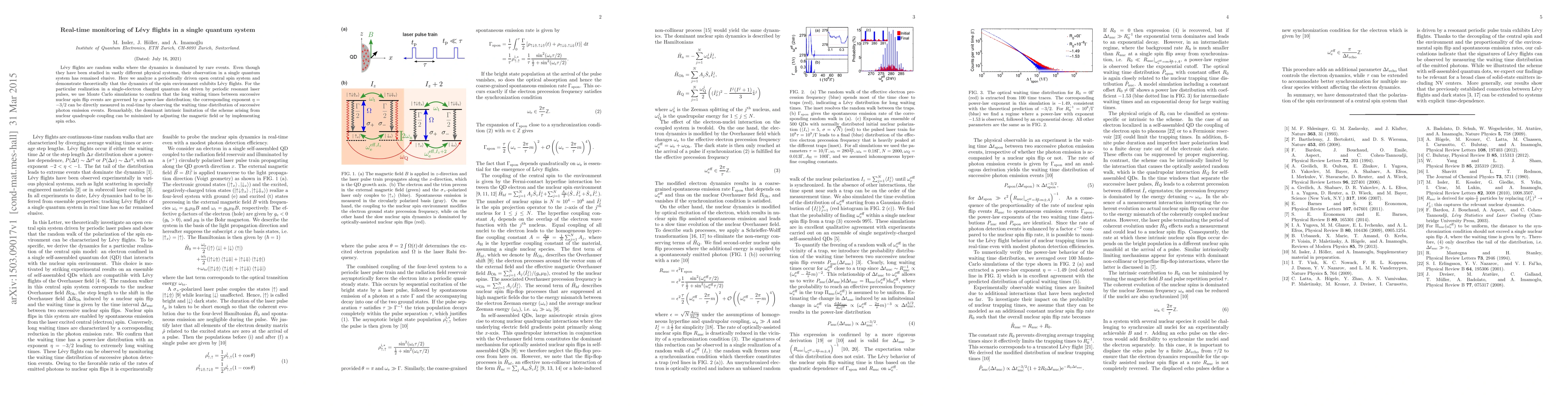L\'evy flights are random walks where the dynamics is dominated by rare events. Even though they have been studied in vastly different physical systems, their observation in a single quantum system has remained elusive. Here we analyze a periodically driven open central spin system and demonstrate theoretically that the dynamics of the spin environment exhibits L\'evy flights. For the particular realization in a single-electron charged quantum dot driven by periodic resonant laser pulses, we use Monte Carlo simulations to confirm that the long waiting times between successive nuclear spin flip events are governed by a power-law distribution; the corresponding exponent $\eta =-3/2$ can be directly measured in real-time by observing the waiting time distribution of successive photon emission events. Remarkably, the dominant intrinsic limitation of the scheme arising from nuclear quadrupole coupling can be minimized by adjusting the magnetic field or by implementing spin echo.